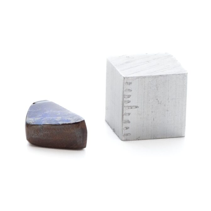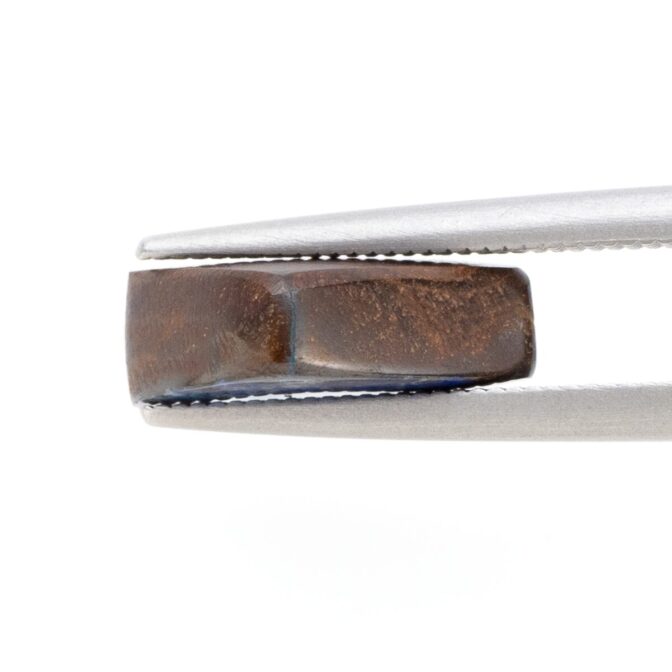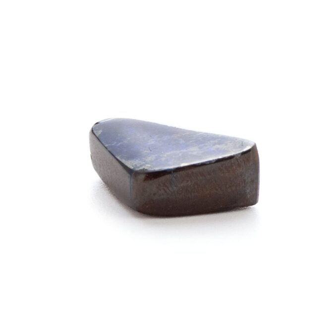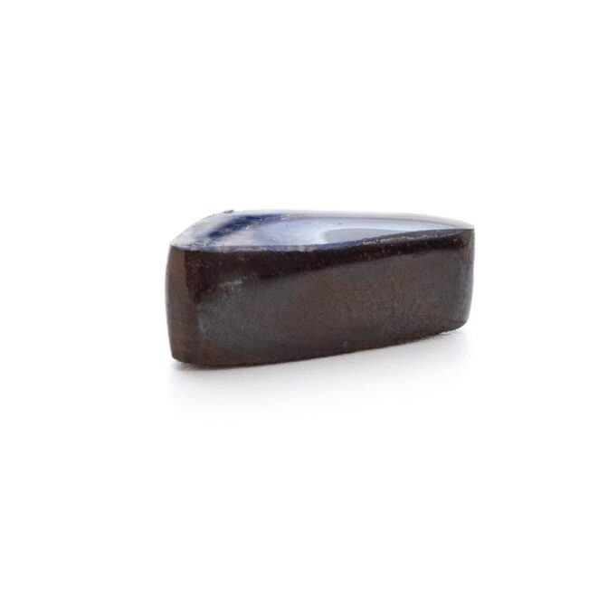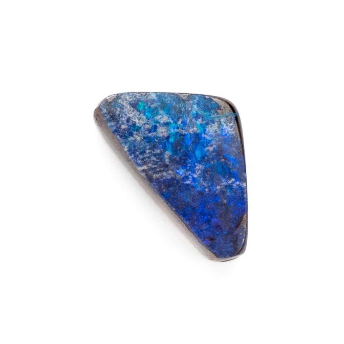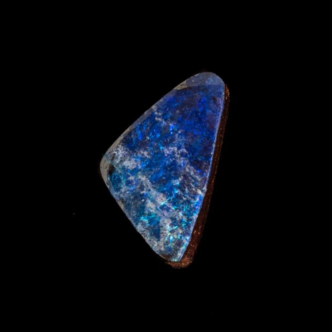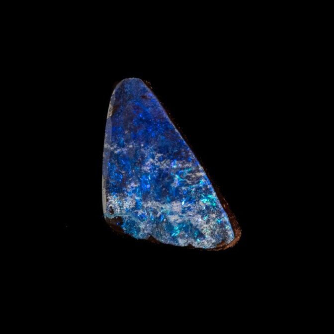 このページでご紹介しているボルダーオパールは、大変状態がよく、質も良いデッドストック。香港に買い付けに行った際、オーナーすら存在を忘れていたという逸話があります。引退するオパール専門店からまとめて引き取ったものの、数が多すぎてジュエリーにするにも手が届かず、持て余していたとのこと。なるほど、ジュエリー用だったからこその質の良さなのですね。上質なボルダーオパールは、カラット数を保つため、どうしても大粒になりがち。ですが今回のロットはやや小さめに形よくカットされ、ジュエリーにぴったりサイズなのが嬉しいところ。漆黒に艶めく母岩の間からチカチカと星のように瞬く遊色は鮮やかな紺色。鮮烈な輝きが黒い母岩から湧き出す様子はまるで夜空を走り抜ける雷鳴のよう。シックなのに華やかという相反する要素を持つ、2面性があるルースです。