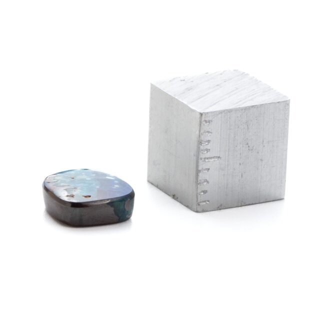 このページでご紹介しているボルダーオパールは、大変状態がよく、質も良いデッドストック。香港に買い付けに行った際、オーナーすら存在を忘れていたという逸話があります。引退するオパール専門店からまとめて引き取ったものの、数が多すぎてジュエリーにするにも手が届かず、持て余していたとのこと。なるほど、ジュエリー用だったからこその質の良さなのですね。上質なボルダーオパールは、カラット数を保つため、どうしても大粒になりがち。ですが今回のロットはやや小さめに形よくカットされ、ジュエリーにぴったりサイズなのが嬉しいところ。漆黒に艶めく母岩の間からチカチカと星のように瞬く遊色は鮮やかな紺色。鮮烈な輝きが黒い母岩から湧き出す様子はまるで夜空を走り抜ける雷鳴のよう。シックなのに華やかという相反する要素を持つ、2面性があるルースです。