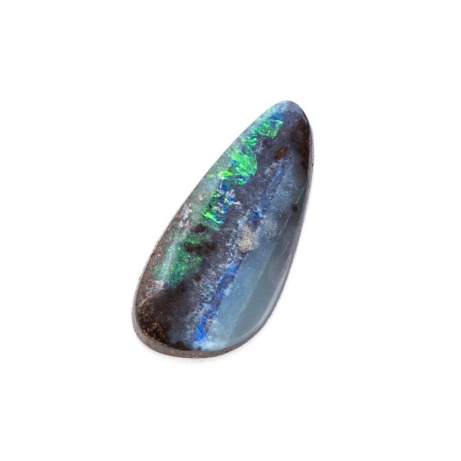 母岩の中にオパール層が入り込み、形成されるボルダーオパール。母岩の隙間からほとばしる遊色の輝きと、模様のように入り組んだ鉱物たちが織りなす美しさは、芸術品の域に達します。主にオーストラリアで産出しますが、残念ながら年々採掘量が減っており、価格が急騰している石の一つでもあります。