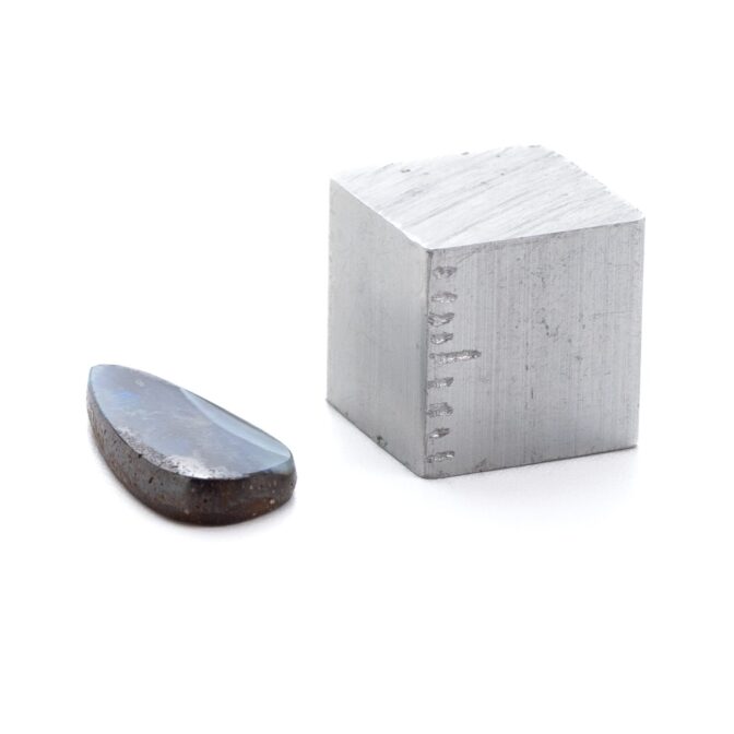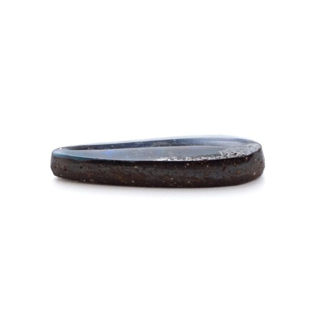 このページでご紹介しているボルダーオパールは、大変状態がよく、質も良いデッドストック。香港に買い付けに行った際、オーナーすら存在を忘れていたという逸話があります。引退するオパール専門店からまとめて引き取ったものの、数が多すぎてジュエリーにするにも手が届かず、持て余していたとのこと。なるほど、ジュエリー用だったからこその質の良さなのですね。上質なボルダーオパールは、カラット数を保つため、どうしても大粒になりがち。ですが今回のロットはやや小さめに形よくカットされ、ジュエリーにぴったりサイズなのが嬉しいところ。漆黒に艶めく母岩の間からチカチカと星のように瞬く遊色は鮮やかな紺色。鮮烈な輝きが黒い母岩から湧き出す様子はまるで夜空を走り抜ける雷鳴のよう。シックなのに華やかという相反する要素を持つ、2面性があるルースです。