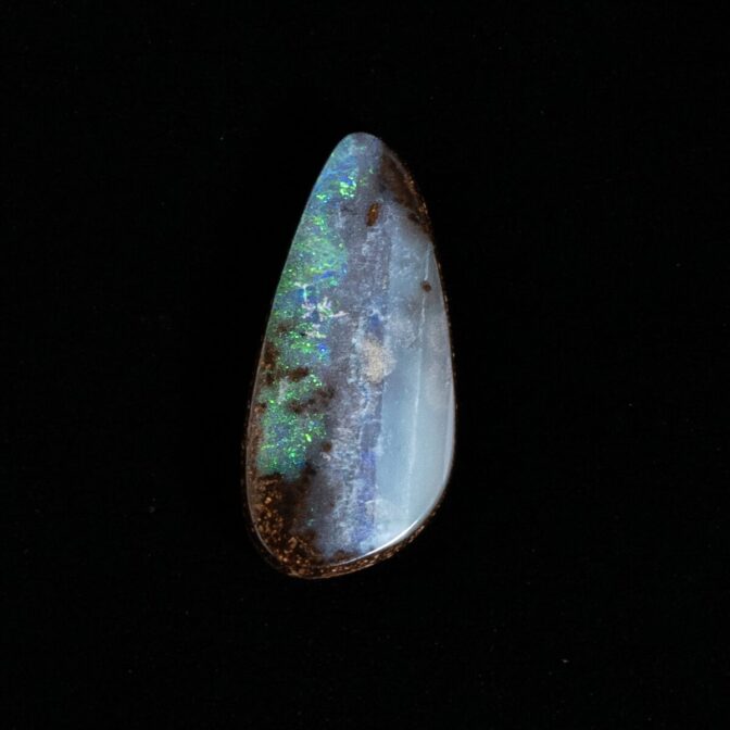 小さめとはいえど、鑑賞するには十分な大きさがあり、光が当たった時に溢れ出る遊色を石の表面全てで楽しめます。深く、暗い地球の底から、きらめく閃光のように地表まで押し出されてきた美しいオパールを捕まえてルースに仕立てた一点もの。ペンダントヘッドに仕立ててればゆらゆらと揺れる大地の輝きを楽しんで頂けます。