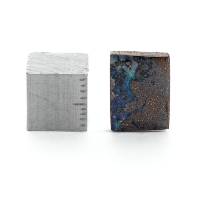 このページでご紹介しているボルダーオパールは、大変状態がよく、質も良いデッドストック。香港に買い付けに行った際、オーナーすら存在を忘れていたという逸話があります。引退するオパール専門店からまとめて引き取ったものの、数が多すぎてジュエリーにするにも手が届かず、持て余していたとのこと。なるほど、ジュエリー用だったからこその質の良さなのですね。上質なボルダーオパールは、カラット数を保つため、どうしても大粒になりがち。ですが今回のロットはやや小さめに形よくカットされ、ジュエリーにぴったりサイズなのが嬉しいところ。母岩と深い藍色の遊色を持つオパール層の対比が美しく、みずみずしく透明感あふれるなオパールがあり、アクセントになっているところもポイントです。