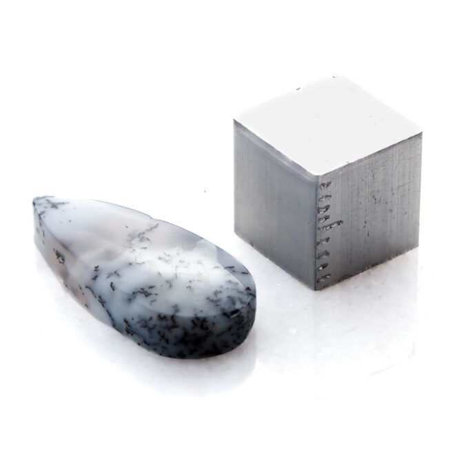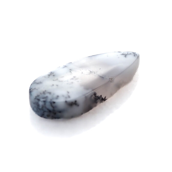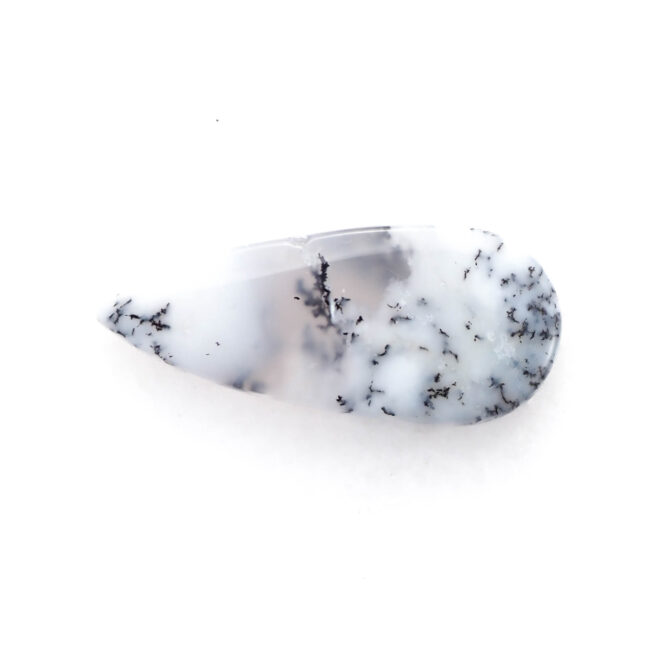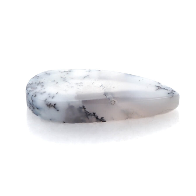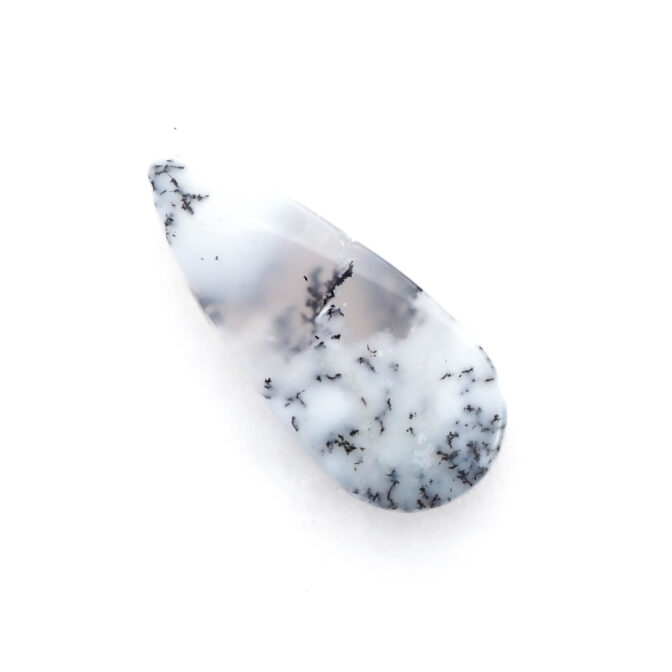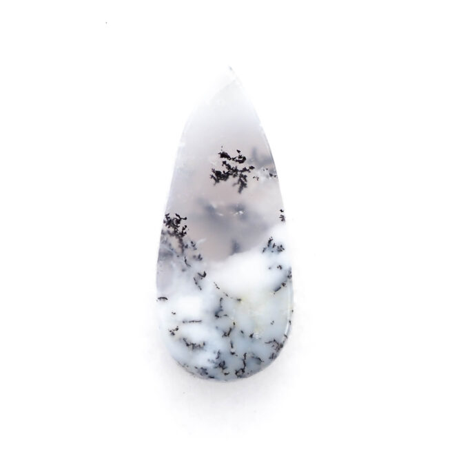 このページでご紹介しているデンドライトオパールは、全体的にややグレイがかった色味が楚々とした魅力。雪の様な純白の上部から、柔らかく透き通る、半透明な質感をへてグレイッシュカラーへのグラデーションが見事。ほっそりとしたテイアドロップシェイプも甘さ控えめで、凛とした佇まいです。ユニークなインクルージョンと、雪景色の様な模様で、ジュエリーに仕立てても素敵です。リングだと傷が心配、という方はペンダントトップに仕立てても美しいですよ。