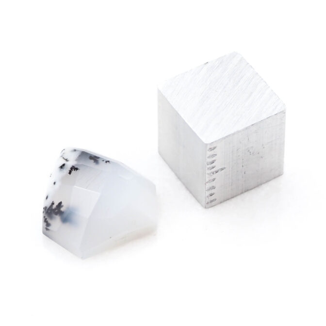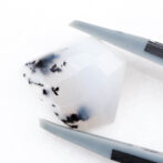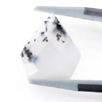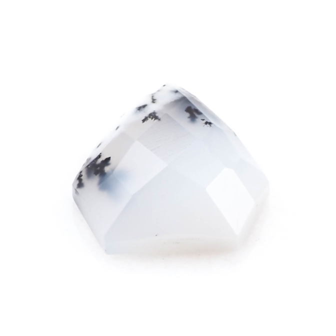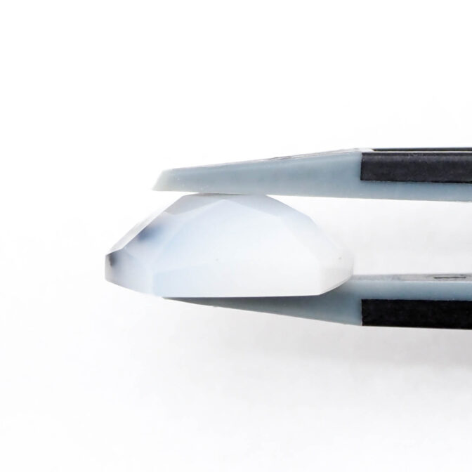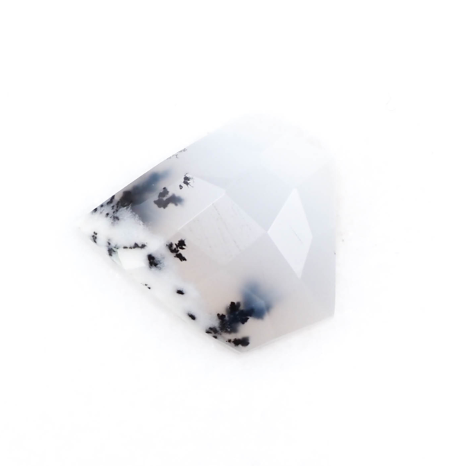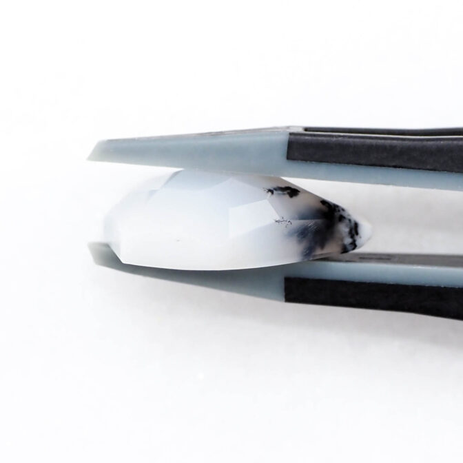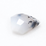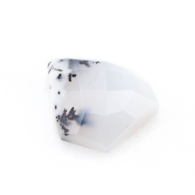 オパールはコモン、プレシャスに関わらずカボションに磨かれることが多いのですが、こちらのルースはチェスカットが施されており、キラキラとまばゆくきらめいています。柔らかく半透明な質感の乳白色からパキッとしたホワイトカラーへのグラデーションも見事。ルースの片側に偏りながらぽつぽつと入っているデンドライトの入り方もとてもおしゃれです。