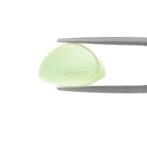 この石の特徴である潤んだような光沢感と、光を石の中で捉え、内側から発光するような輝き方を最大限に引き出せるのは、カボションカットに尽きます。このページでご紹介しているプレーナイトもオーバルカボションに磨かれています。大粒で山高にカットされ、深く豊かな色と輝きを放ちます。この深い色と輝きをより美しく見せるため、カットにも工夫が。表だけでなく、裏側にも丸みを持たせたダブルカボション仕様になっています。おかげで石の厚みが増し、深みのある色とぷるぷるの光沢が実現。実は地味に手間がかかるカットなので、きちんと石と向き合っている方が研磨したのだなあ、と感慨もひとしお。