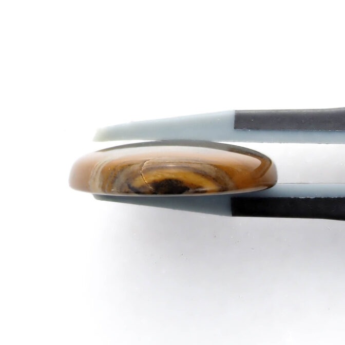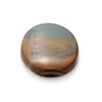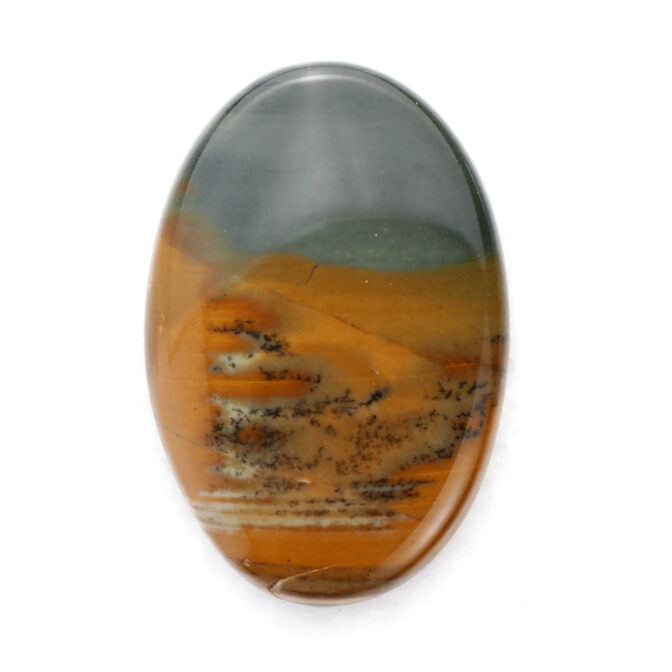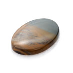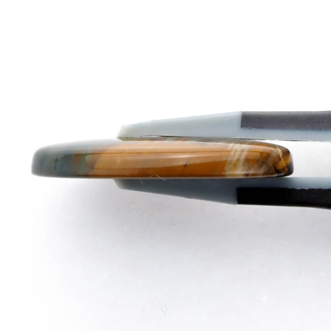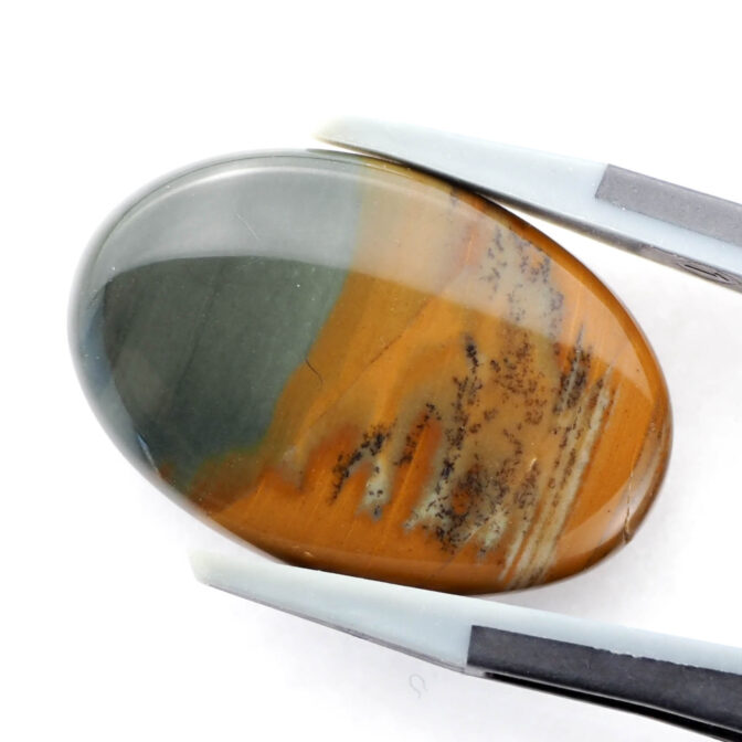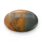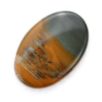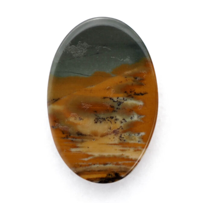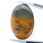 高さを抑えたつるりとしたドーム状に磨かれたこのルースの名はモリソナイト。鉱物としてはジャスパーに分類され、発見者のジェームス・モリソン氏の名前を取って「モリソナイト」と呼ばれています。このジェームス・モリソン氏、アメリカのオレゴン州にあるマルヒヤー渓谷という自然豊かな場所(大変ワイルド)に住み着き、周辺を探検しながら暮らしていた方です。現在、このモリソナイトが産出する鉱山は大変危険なため、立ち入り禁止になっている所もあり、流通量は多くありません。また、本国のアメリカで大変人気があるので、国外に出てくることもほとんどないマニアックな石でもあります。冒頭の石業者さんがホクホクしてしまう理由もわかりますよね。