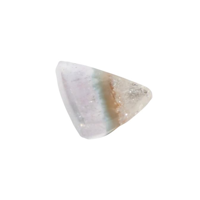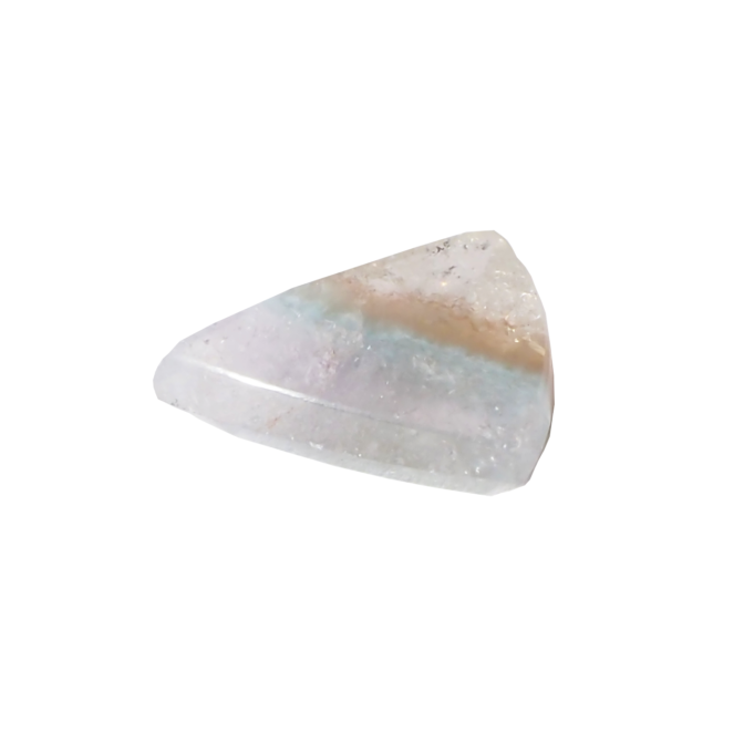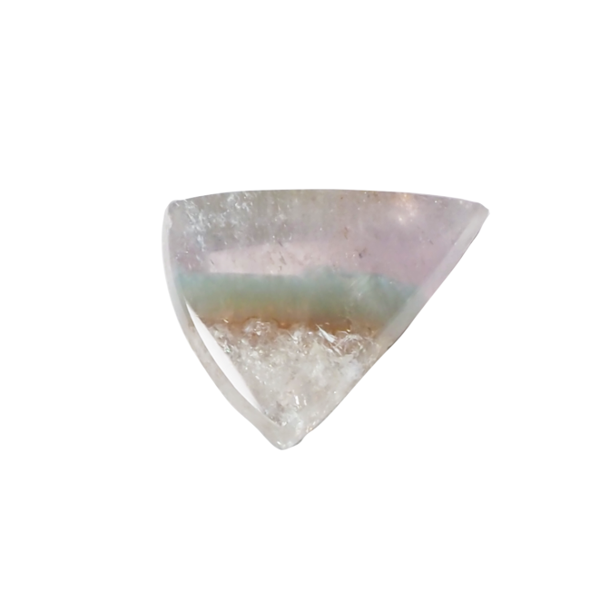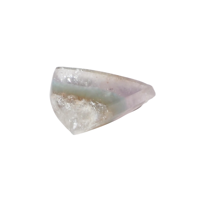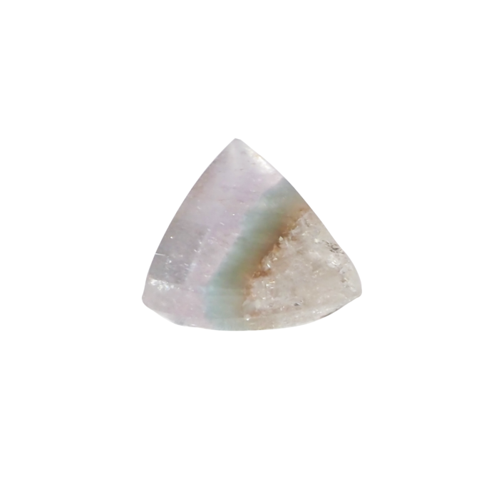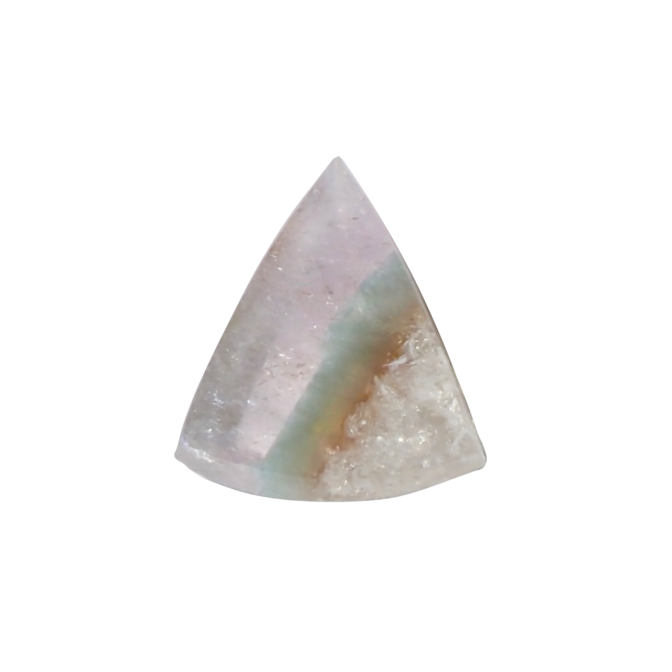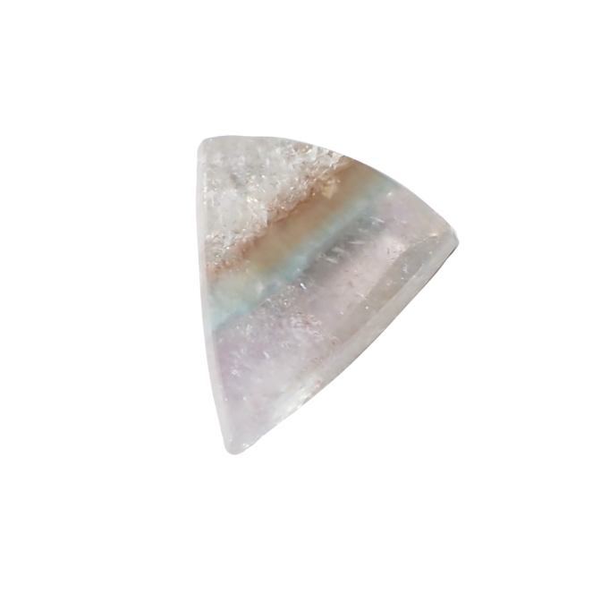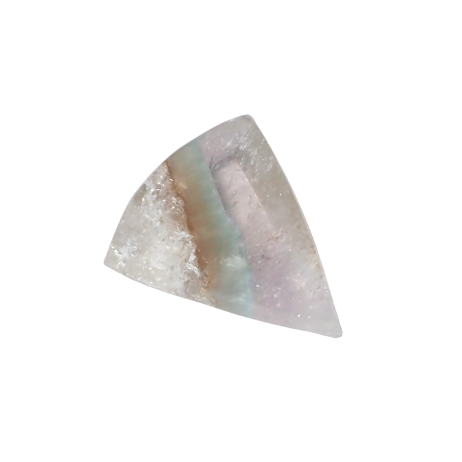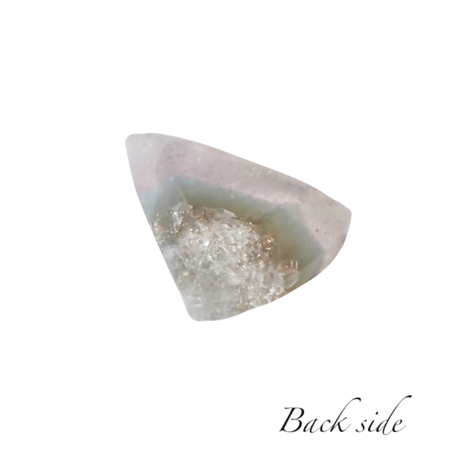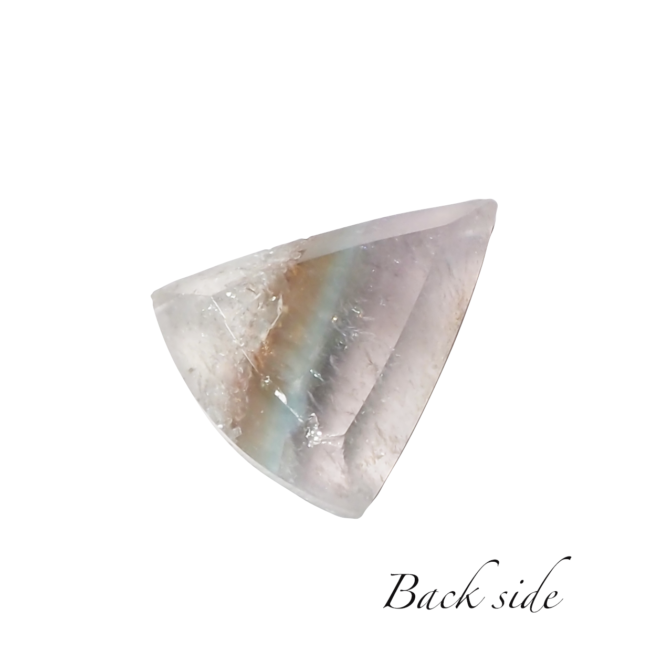 まるむ商会では今回、レアな中でもさらにレアなアメジストと共生しているピースをセレクト。ほんのりと柔らかな紫に染まるアメジスト、透明なクォーツ、ギラライトの鮮烈なブルーのストライプの組み合わせを一つのルースで楽しめ、最高に贅沢!ふっくらしたトライアングルシェイプに斜めに走るストライプがとってもおしゃれ。小さいながらも天然石の不思議がぎゅっと詰まった、まるむ商会自慢のルースです。