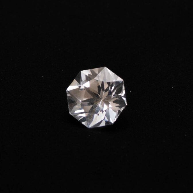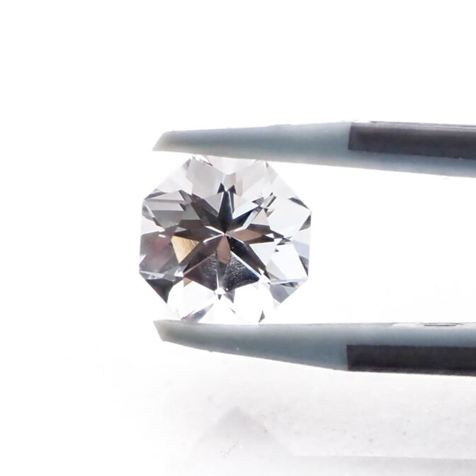 ダンビュライトが素晴らしいのは硬度が7もあり、複雑なカットにも耐える強度があること。その上、劈開(一方向に割れやすい性質。カイヤナイトなどがそうですね。)がほとんどなくとても扱いやすい石でもあります。その代わり、その透明さを輝きの強さを引き出すには正確なカットと丁寧な研磨が必要。これがないと、お手頃なクォーツでいいんじゃない?となってしまいます。美しく複雑なカットが施されてこそ光ががやくことができる石なのです。
