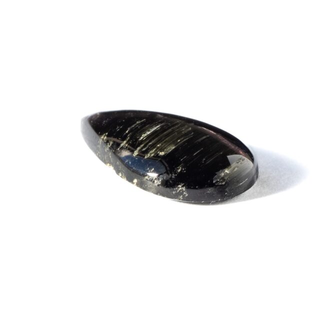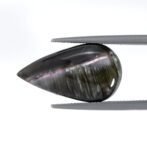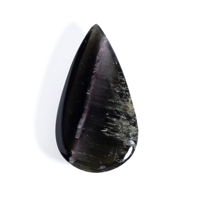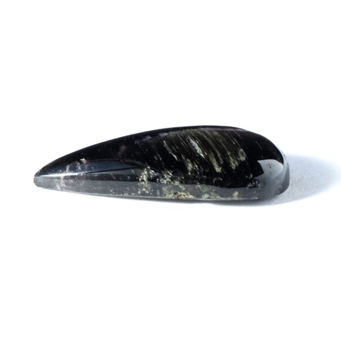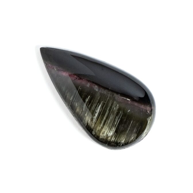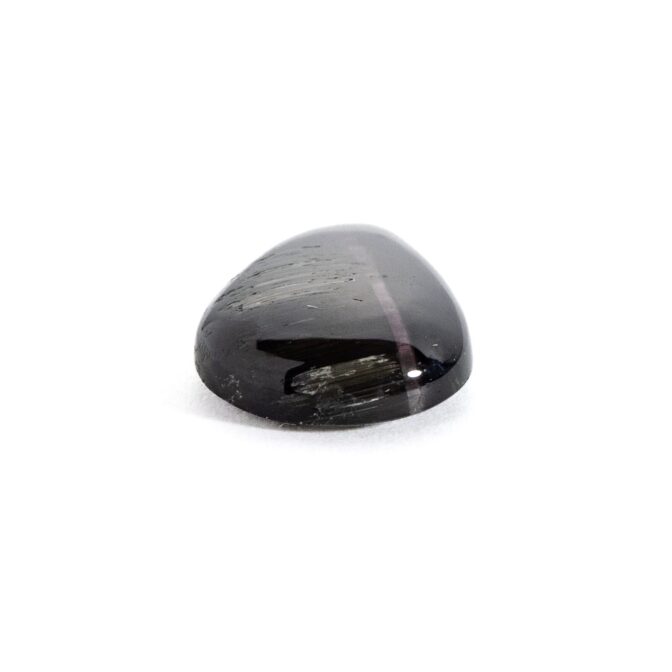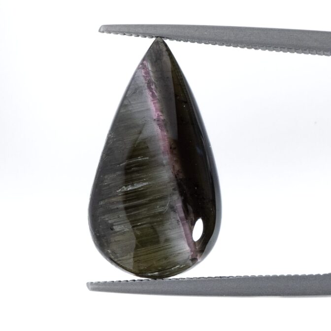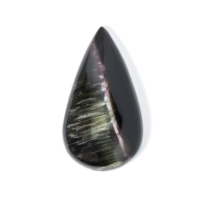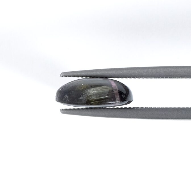 いかに言葉を尽くしても、このトルマリンの美しさは語り尽くせません。まるで、精巧に作られたかのように、一筋の銀色の光芒でピタリと止まるシャトヤンシー。一見色彩がないのに、光の角度によって突然現れる、いかにもトルマリンらしい複雑な色彩美。シャトヤンシーの上にもほんのりと色彩が踊り、全く新しいトルマリンの魅力を発見できる稀有なルースになっています。