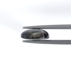 銀の光を束ねたような目眩く鋭い輝き。その上を滑るように移動する銀色の閃光。きらめくキャッツアイが、シックな色のトルマリンを美しく飾ります。その光のいたずらは、一度私たちの目をとらえたら、そう簡単には離してくれなません。光のゆく先に釘付けになっていると、やがて斜めに入ったシャトヤンシーと、ピシリと交差する一筋の光にぶつかります。そこから先は、いかにもトルマリンといった風情の深い透明。一見ブラックトルマリンかと思うほどダークな色合いですが、光に透かすとトルマリンらしい紫やグリーンの鮮やかな色彩が現れます。
