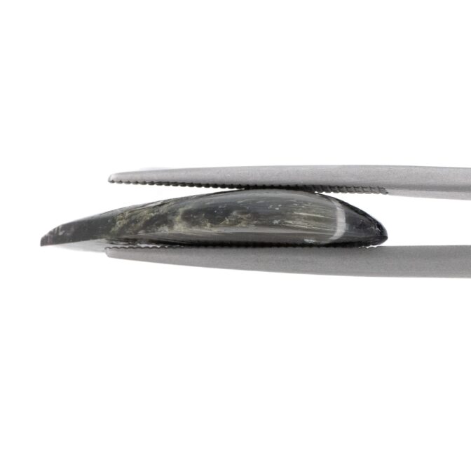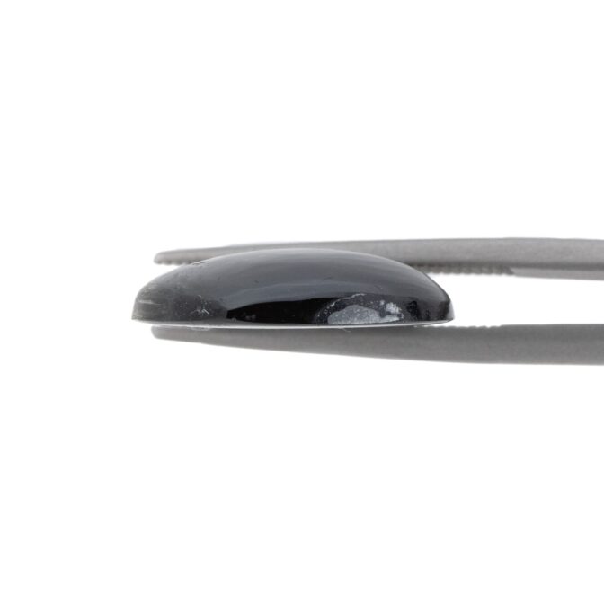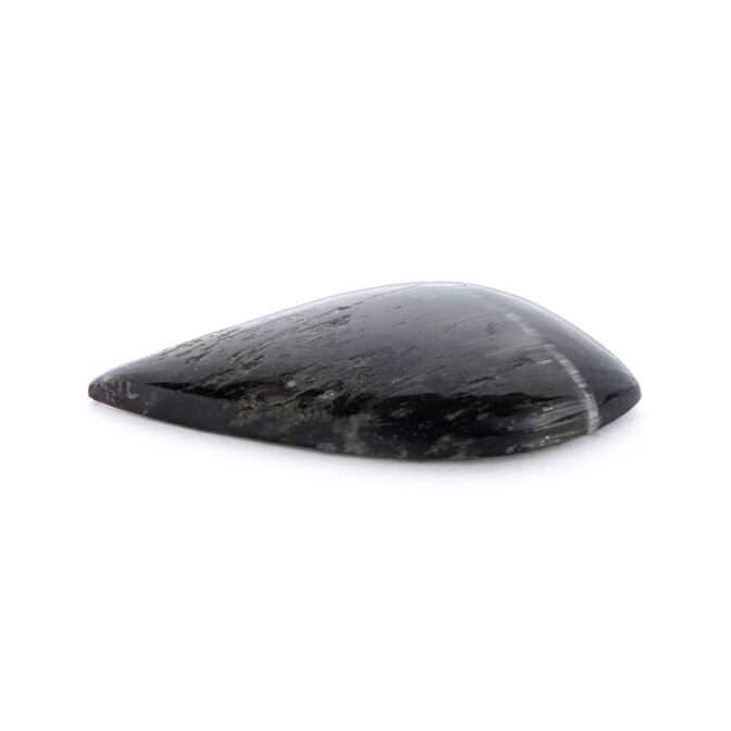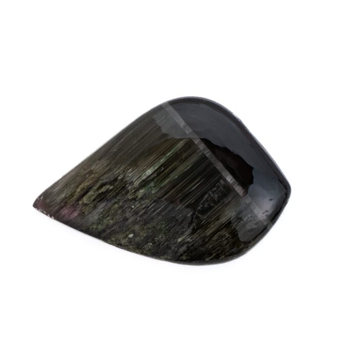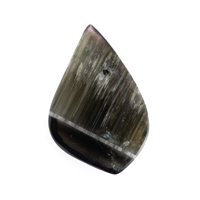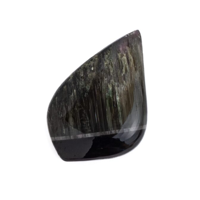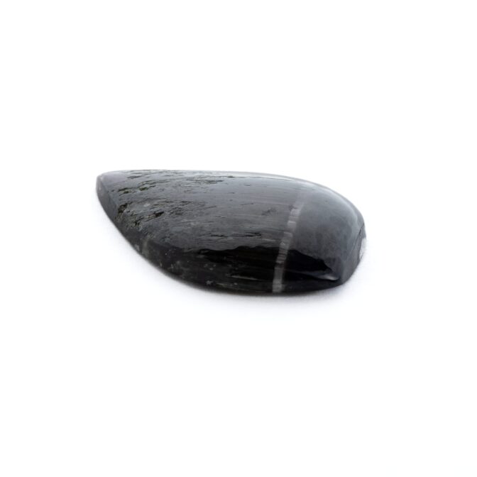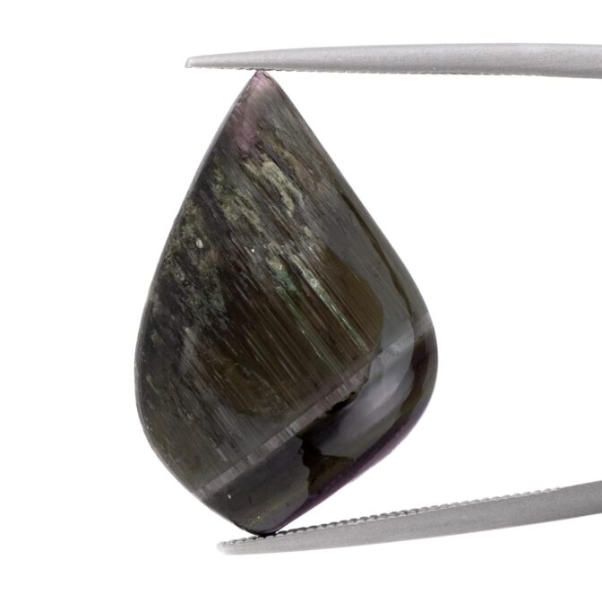 いかに言葉を尽くしても、このトルマリンの美しさは語り尽くせません。まるで、精巧に作られたかのように、一筋の銀色の光芒でピタリと止まるシャトヤンシー。一見色彩がないのに、光の角度によって突然現れる、いかにもトルマリンらしい複雑な色彩美。シャトヤンシーの上にもほんのりと色彩が踊り、全く新しいトルマリンの魅力を発見できる稀有なルースになっています。