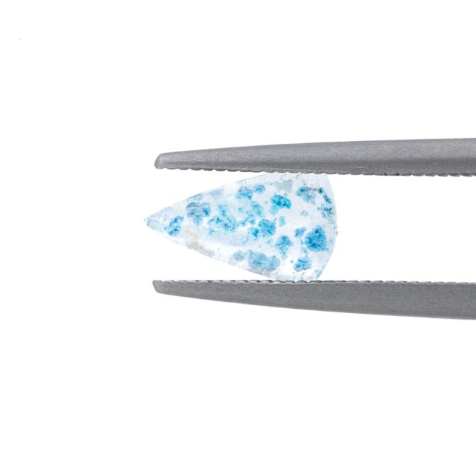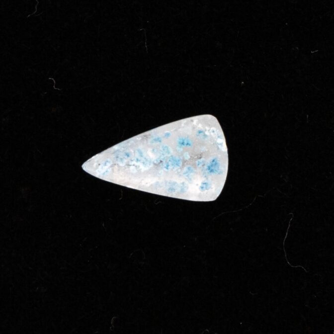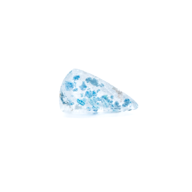 まるでシュワシュワはじけるサイダーのよう。インクルージョンがキラキラと輝くクォーツの中に、鮮烈なパライバブルーのギラライトが泡のようにポップに踊ります。インクルージョン(不純物)がある石でありながらも透明感があり、ギラライトの存在感が際立つ逸品。日の光に透かすと白く輝くクォーツを背景に、可愛らしい水玉模様がフレッシュさを添える、希少なルースです。