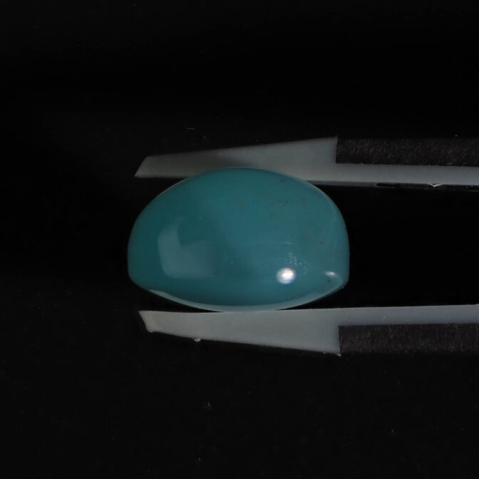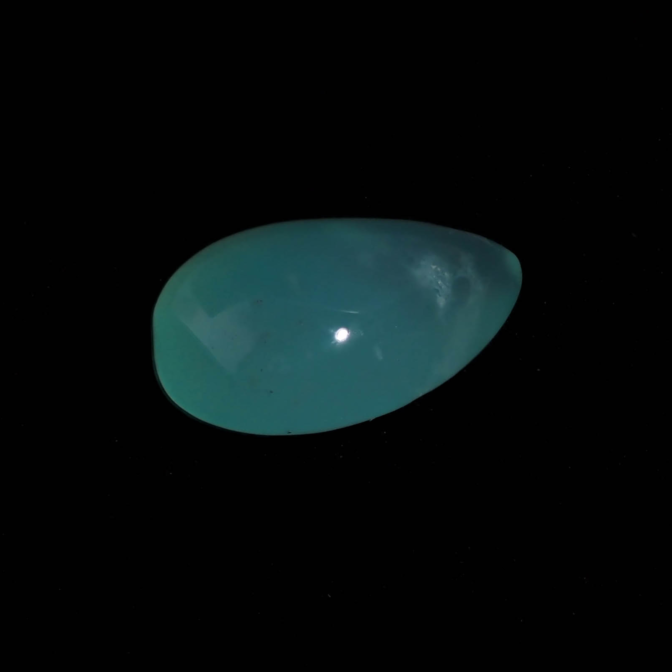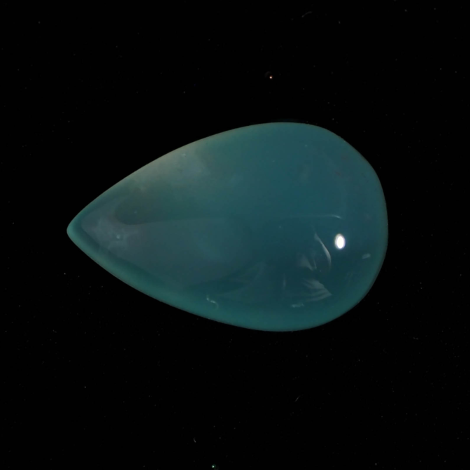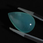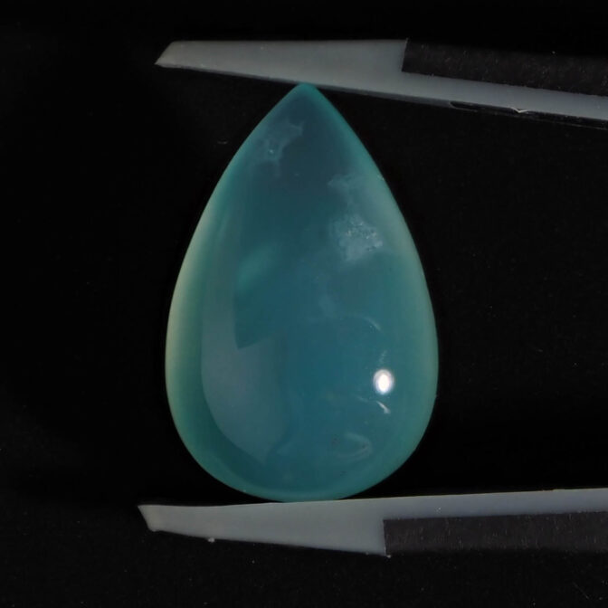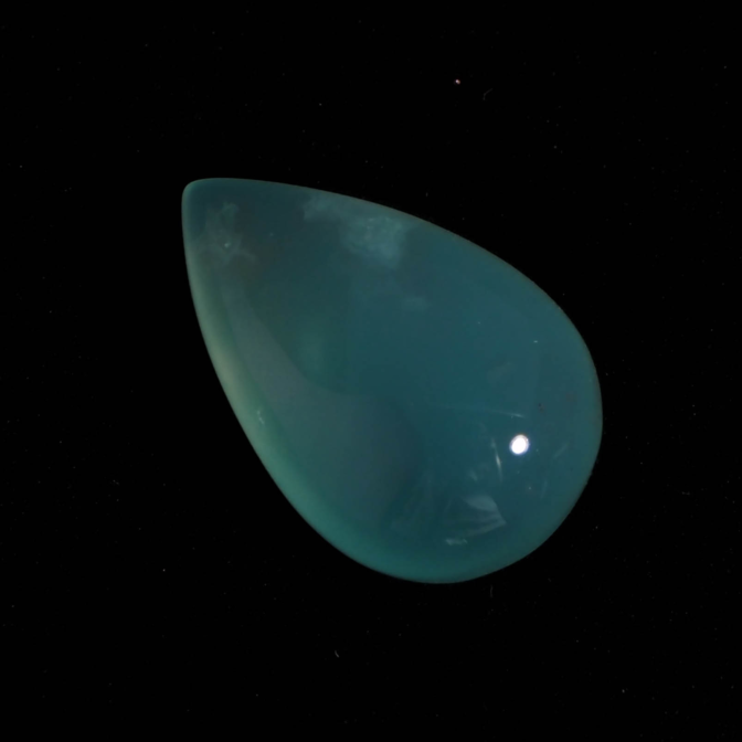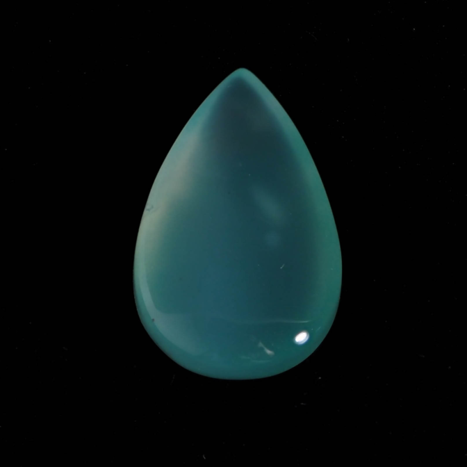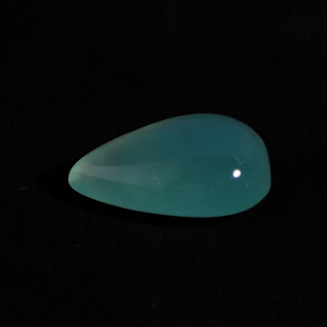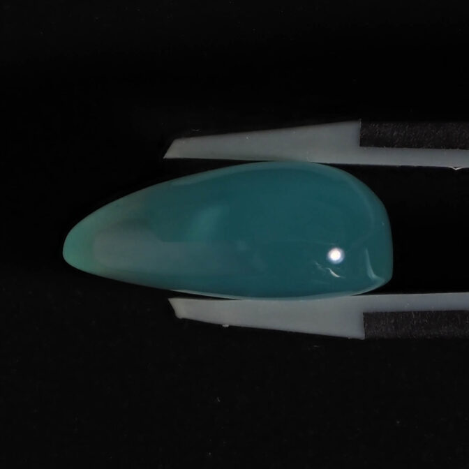 色の濃淡が美しくグラデーションを描くティアドロップシェイプ。ぷるりとした質感と濡れたような輝きが雨粒を連想させます。濃く鮮やかなブルーグリーンは下から上に行くに従って薄くなり、自然が作り出した色の変化を楽しめます。大粒で縦の長さがあるため、リングではなくバングルやペンダントへのお仕立てがおすすめ。もちろん、ルースのままコレクションピースにするのも楽しい高品質なルースです。
