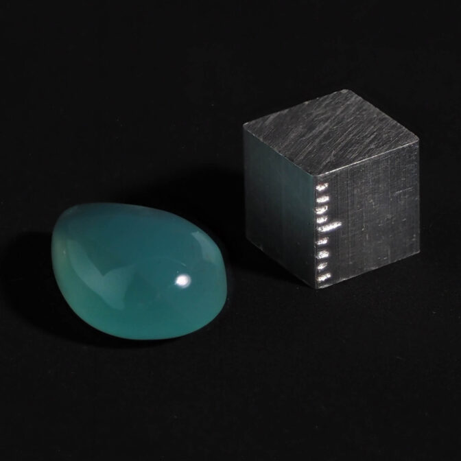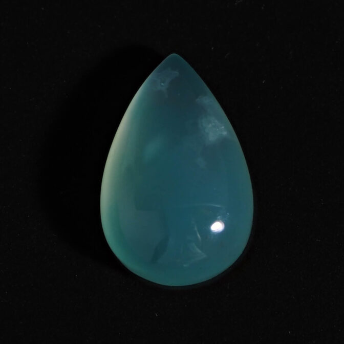 2000年代に新たに見つかった比較的新しい宝石、アクアプレーズ。カルセドニーの仲間で、名前がよく似ているクリソプレーズとは、実は兄弟のような間がら。クリソプレーズの発色にはニッケルが関わっており、鮮やかなアップルグリーンになります。アクアプレーズはクリソプレーズとは違って青みが強く、この色はクロムにより発色しています。