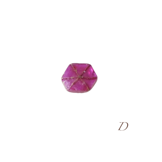ところが、こちらのページでご紹介しているトラピッチェルビーは後ろ側が透けるほど透明度が高く、つやりと磨かれ6条の線もはっきり見える極上品。