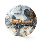 灰色のモノトーンで描かれるモノクロの世界に、鮮やかなイエローが差し色。山水画を現代にアップデートしたような大胆さと細やかさ、そして沈んだ色と鮮やかな色のコントラストが見事。モザイク模様を一つ一つ目で追いかけるたび、新しい発見があるマリガノジャスパーのルースは、モダンなセンスを感じさせる洗練されたデザインで、見るものの心を惹きつけます。