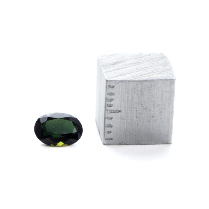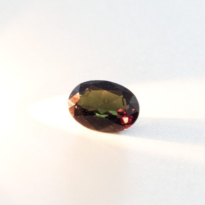 こちらのカラーチェンジトルマリン、透明度が高く、鮮やかでクリーンな緑色の美しいのですが、昼光色の光でやや紫色を帯びた赤褐色に色を変えます。石自体の色がガラリと変わる、というよりは、カット面が反射する光の色が変わるという感覚。ふとした拍子にパチパチとグリーン以外の色が弾け、その不思議さに目を奪われてしまいます。このカラーチェンジの仕組みは、グリーンに発色する元となるクロムであると推察されています。
