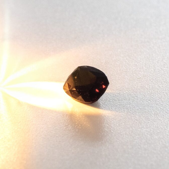 こちらのカラーチェンジトルマリン、透明度が高く、鮮やかでクリーンな緑色の美しいのですが、昼光色の光でやや紫色を帯びた赤褐色に色を変えます。石自体の色がガラリと変わる、というよりは、カット面が反射する光の色が変わるという感覚。ふとした拍子にパチパチとグリーン以外の色が弾け、その不思議さに目を奪われてしまいます。このカラーチェンジの仕組みは、グリーンに発色する元となるクロムであると推察されています。