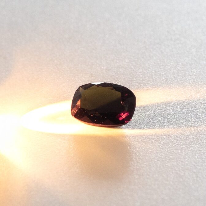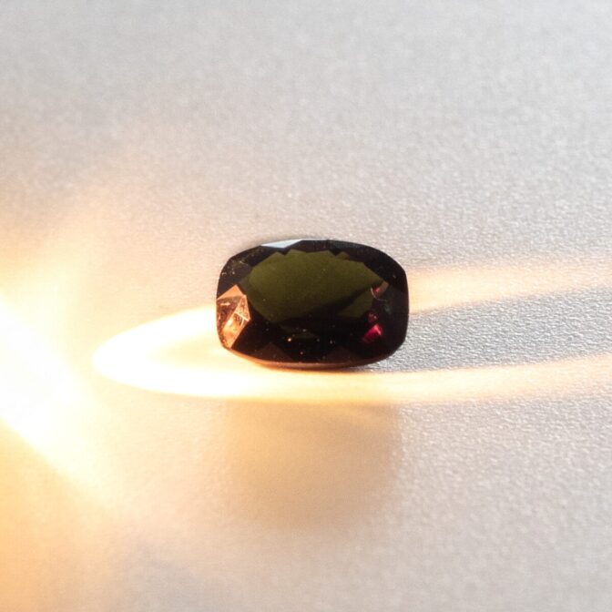 とてもレアで滅多にお目にかかることができないカラーチェンジトルマリン。柔らかい曲線を持つ長方形のブリリアントカットにカットされ、ジュエリーに加工しやすいのも魅力。角度によって色の輝きがほのかに変わるので、リングにすると良いですよ。もちろん、ルースのままコレクションピースに加えるのも素敵です。