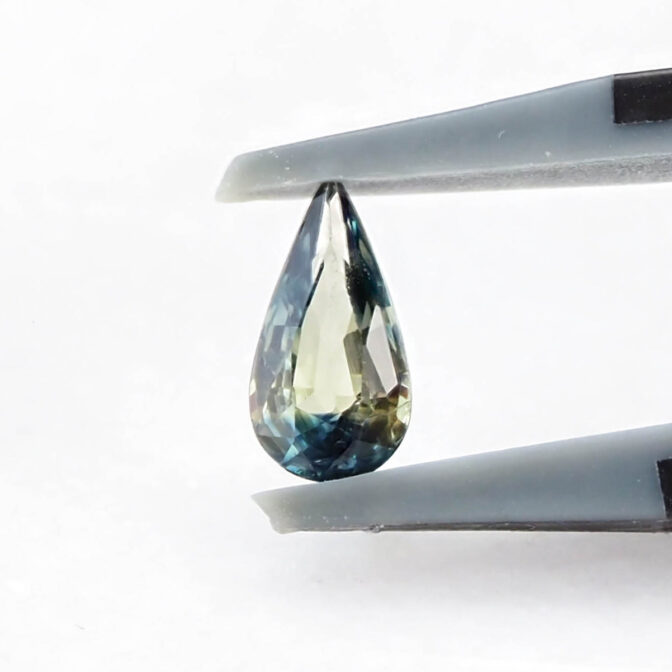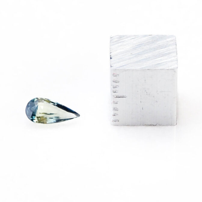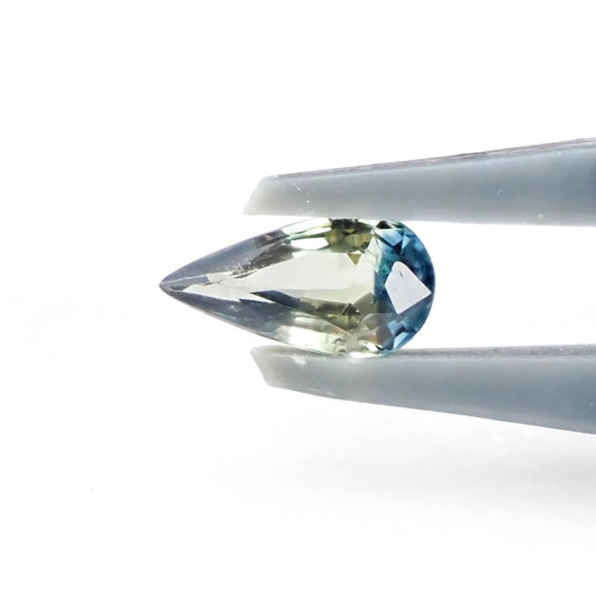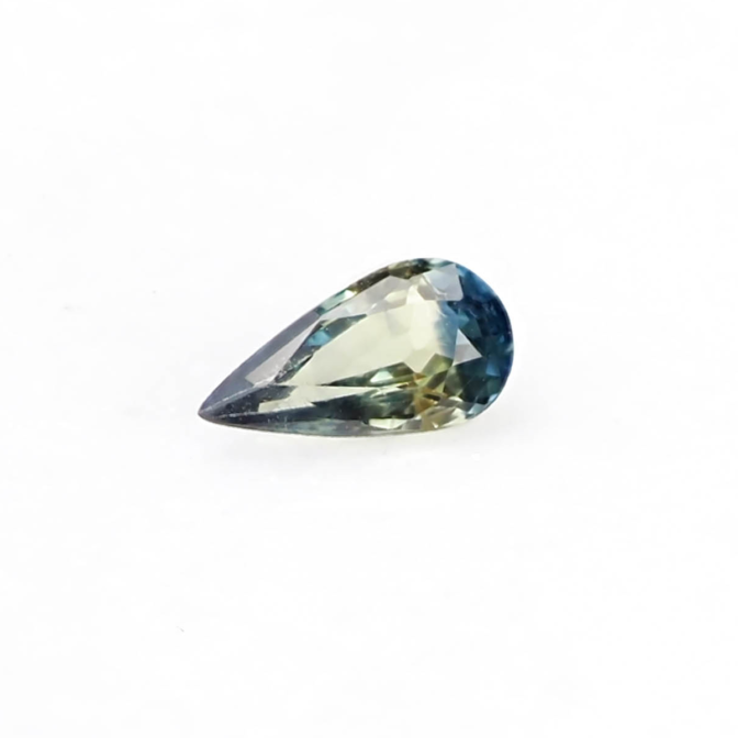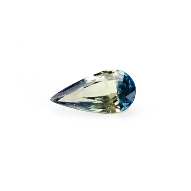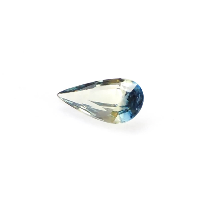 イエローxブルーのバイカラーサファイア。ティアドロップの底に、湧き出る水のようにゆらめくブルーが斬新。原石はどんな感じだったのかしら?と想像が広がります。サファイアならではのシャープな輝きも楽しめ、はっきりと色が別れたバイカラーは個性的な彩りを持つ世界に1つだけの宝物。