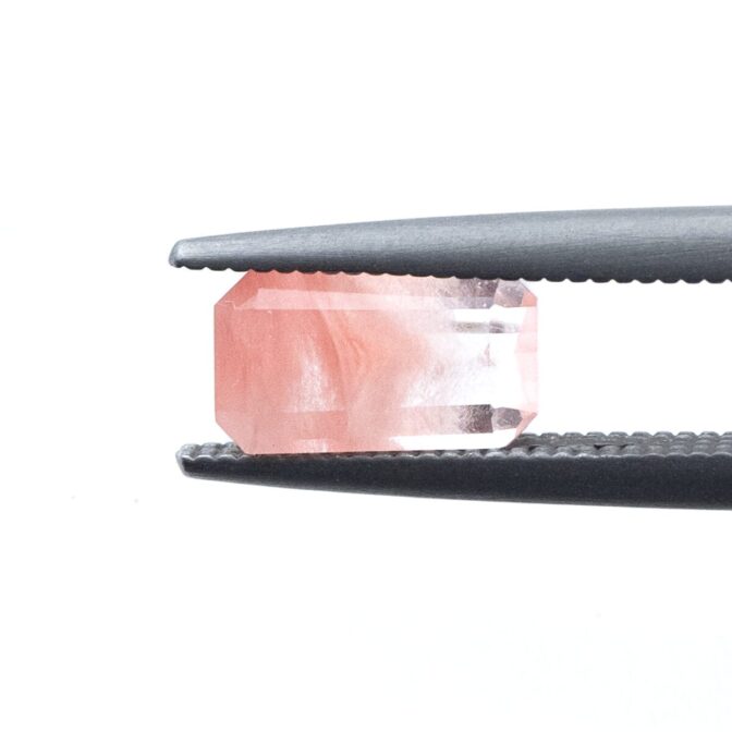 水晶自体に色がついているのではなく、色がついた繊維状インクルージョンが入っているため、平面的ではなく、奥行きがあり情緒豊かな繊細カラーが特徴。このふわふわの正体は、角閃石という鉱物で、硬いイメージのある鉱物がこんなに柔らかに見えるのが不思議です。様々なカラーバリエーションがあり、グリーン、ブルー、グレイ、レッドなど色によって全く雰囲気が変わるのが面白いですね。今回セレクトしたのは、桜ピンクのエメラルドカットのルースたち。とても品がよく、そっと素肌に寄り添いながらも明るくきらびやかに存在感を放ちます。