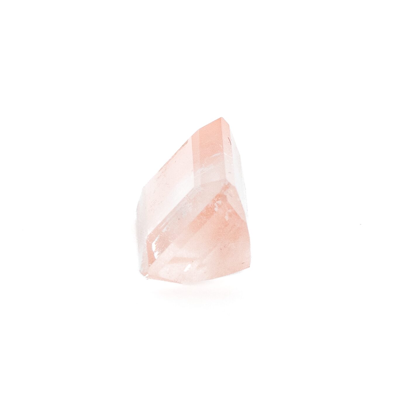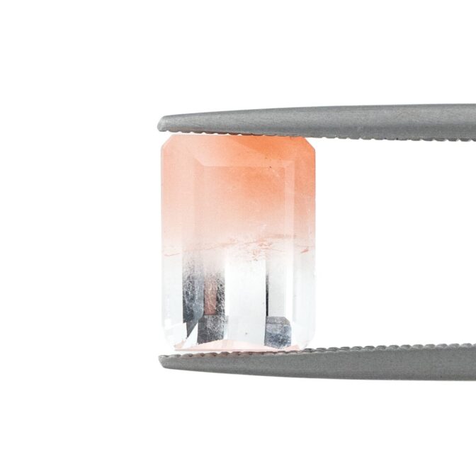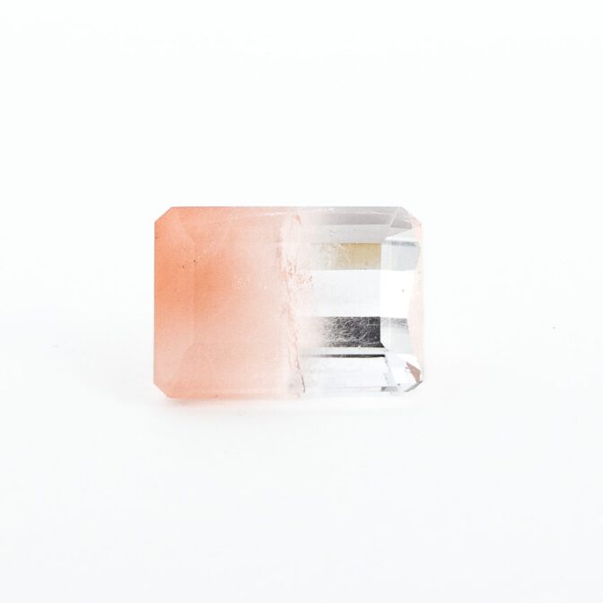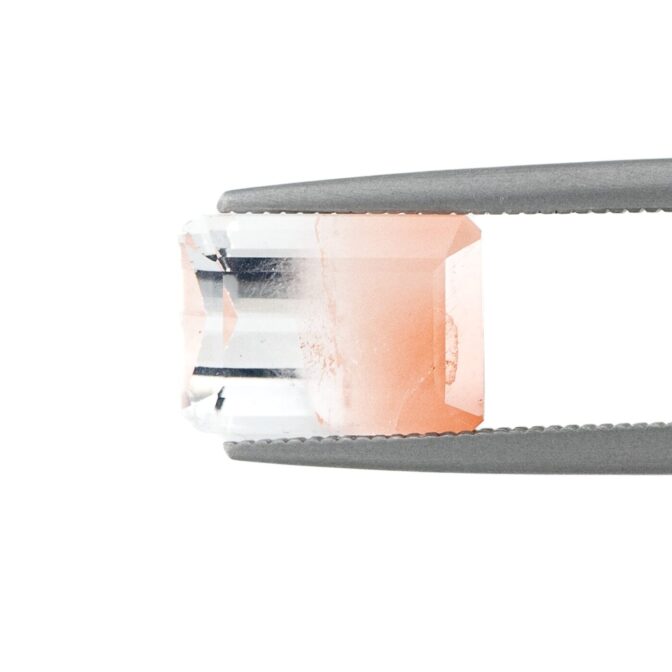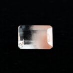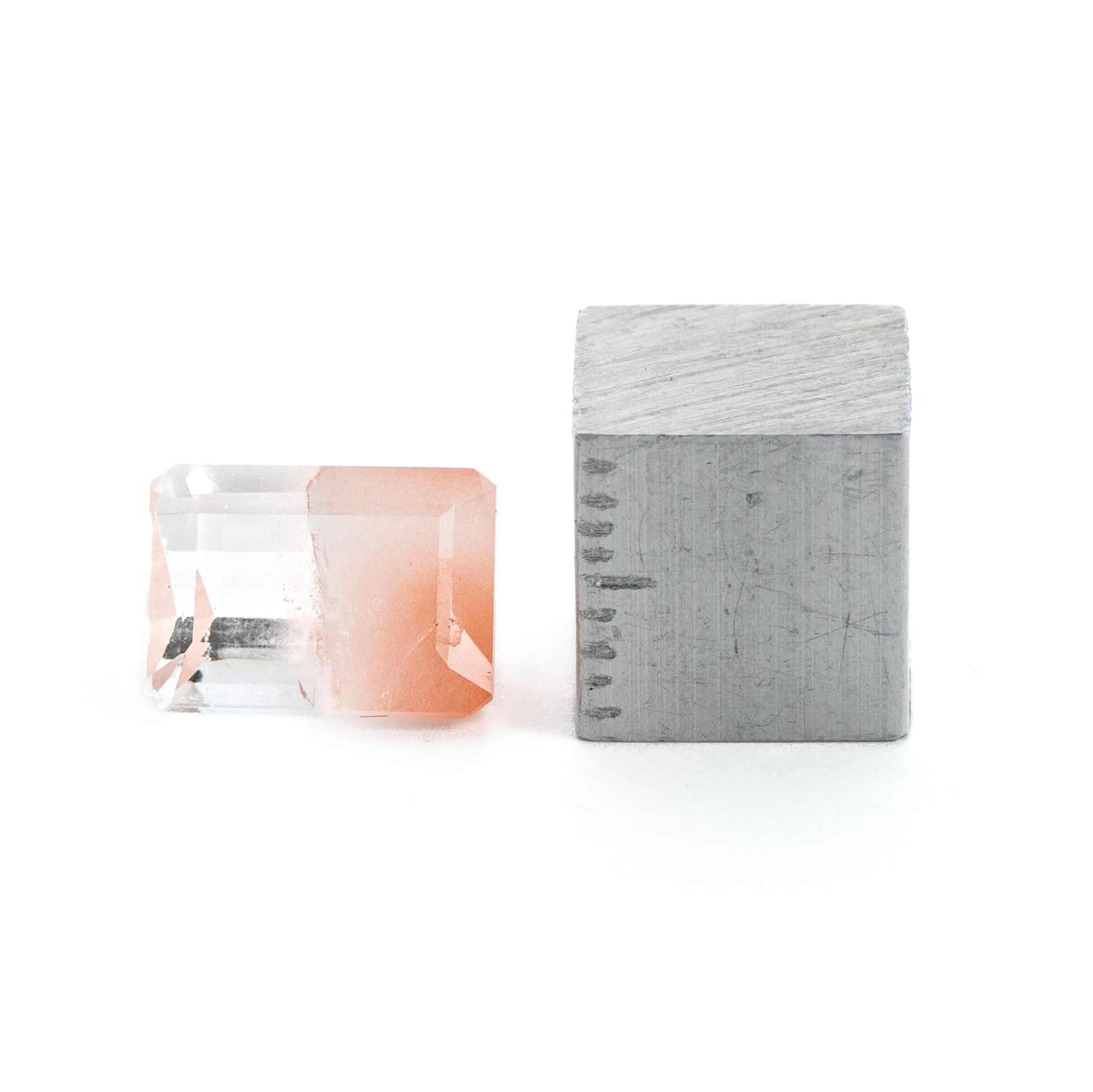 ところが、これがツーソンマジックでしょうか。端正なエメラルドカットを施され、よそ行きのおしゃれ感を手に入れた、素敵なアンフィボールを見つけてしまいました。今回買い付けた中でも一番の大物で、宝石としての魅力を残しつつも、とても存在感があります。サーモンピンクの優しいアンフィボールから始まり、結晶の成長痕をはっきり刻んだストライプを挟んで、ふんわりとしたグレーで終わる。可愛いだけではなく、クールな色合いが、良い意味で期待を裏切ってくれます。アンフィボールの面白さは油断ならない、と改めて思います。