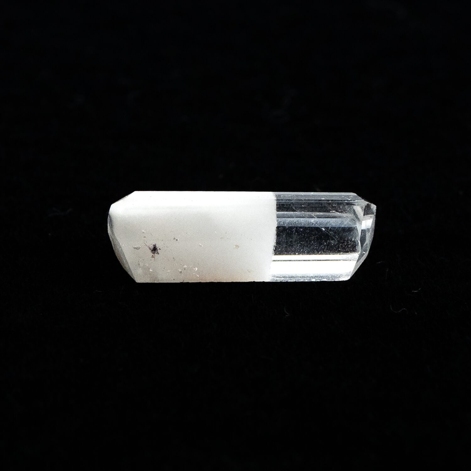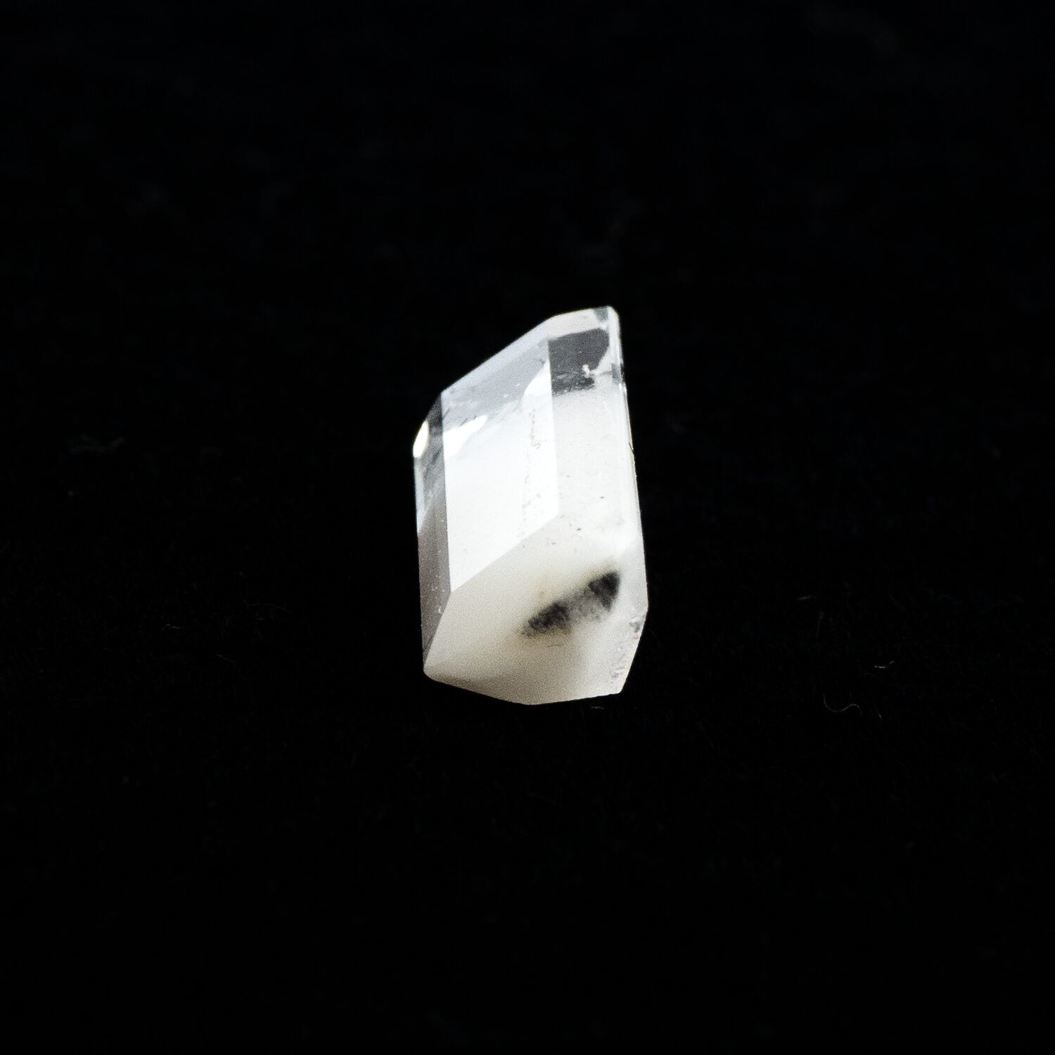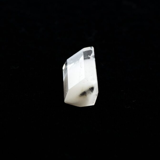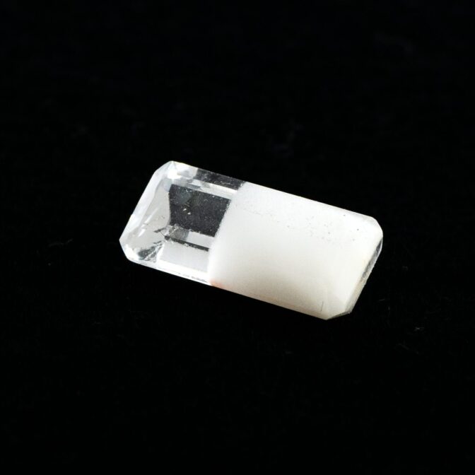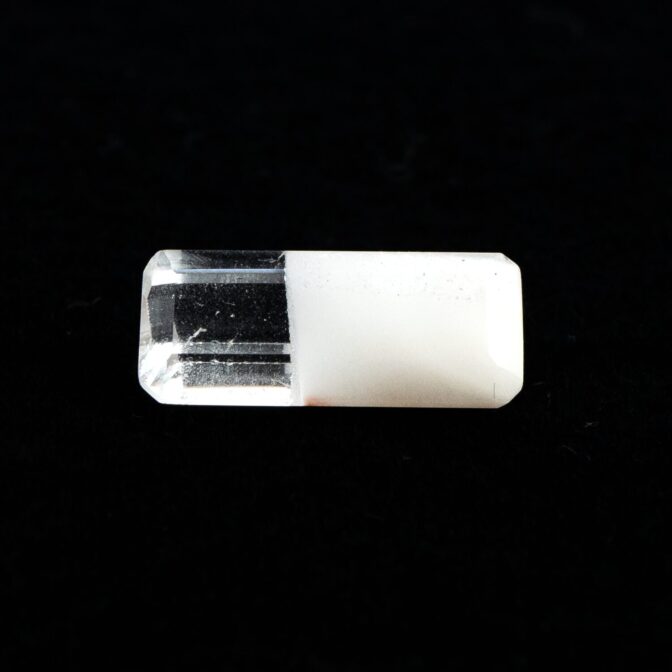 ところが、これがツーソンマジックでしょうか。端正なエメラルドカットを施され、宝石として小さくかたちを整えられたルースの魅力的なこと!ブラジル産の澄み切ったクリアな水晶と、ふんわりとした粉雪のようなスノーホワイトの組み合わせが劇的に美しく、ジュエリーにしたらとても映えそう。落ち着いているのに華やかさがある色合いは、天然の色だからこそ。肌馴染みが良いのに存在感があります。