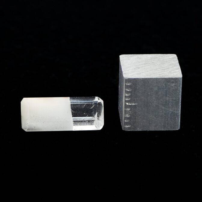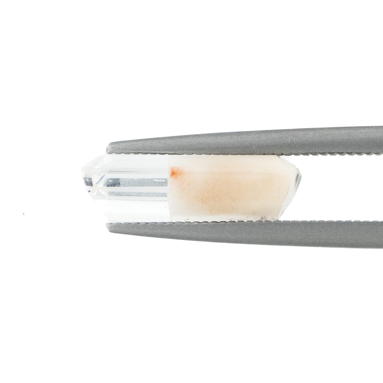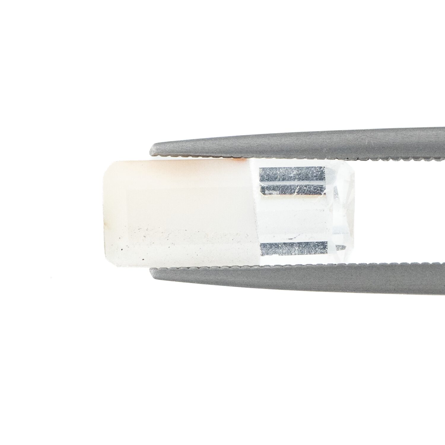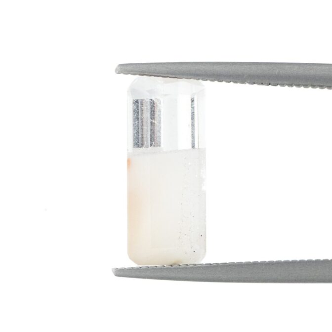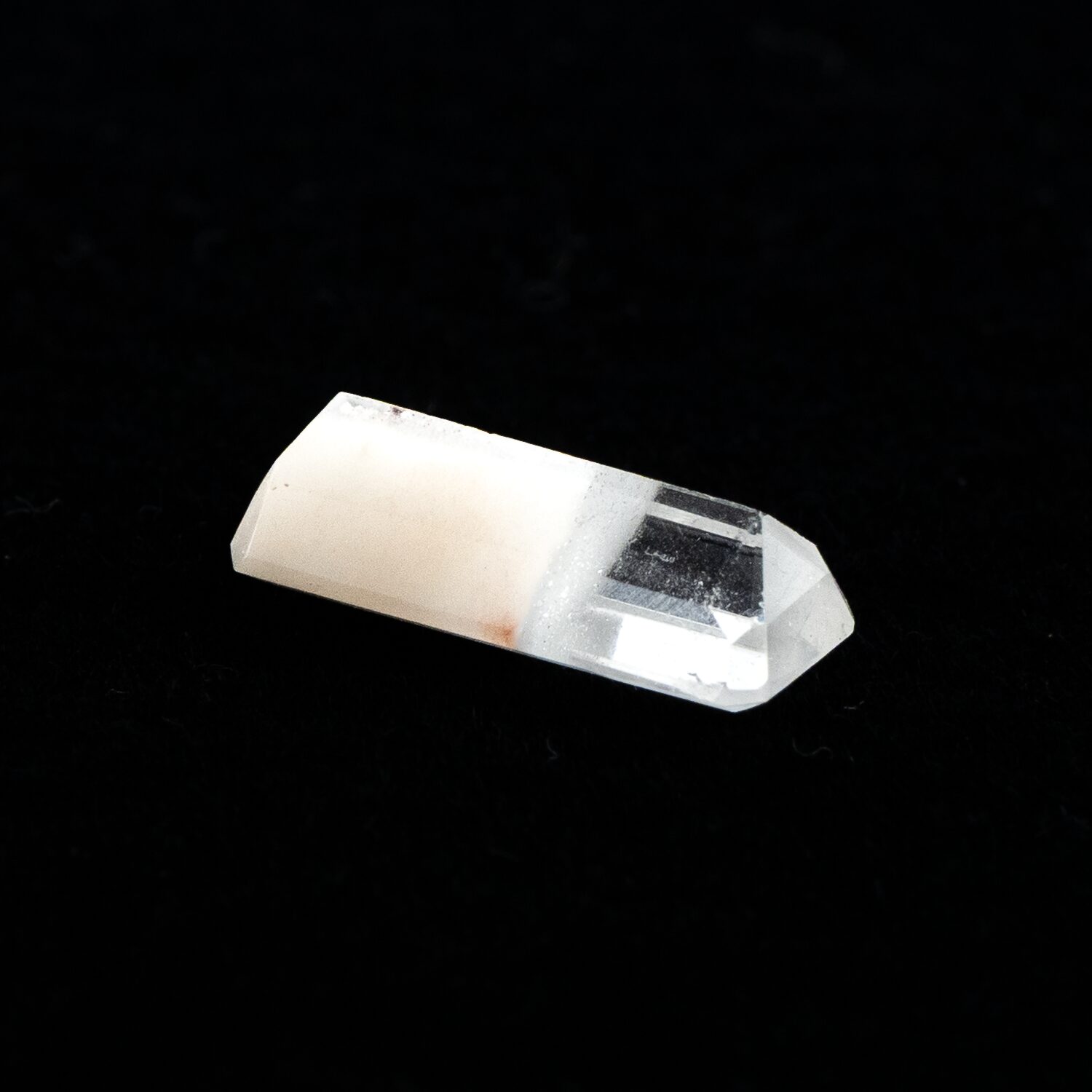 ところが、これがツーソンマジックでしょうか。端正なエメラルドカットを施され、宝石として小さくかたちを整えられたルースの魅力的なこと!ブラジル産の澄み切ったクリアな水晶と、ふんわりとした粉雪のようなスノーホワイトの組み合わせが劇的に美しく、ジュエリーにしたらとても映えそう。落ち着いているのに華やかさがある色合いは、天然の色だからこそ。肌馴染みが良いのに存在感があります。