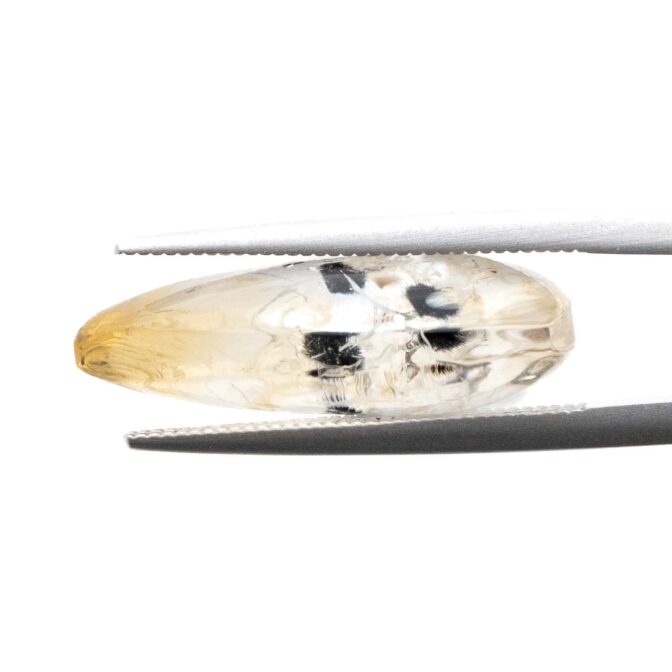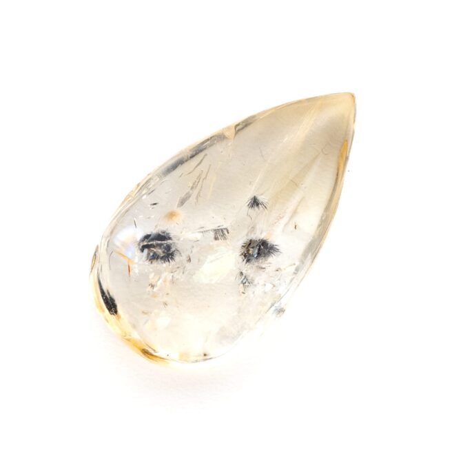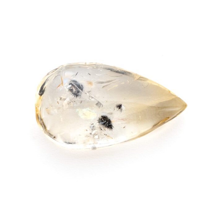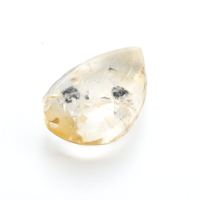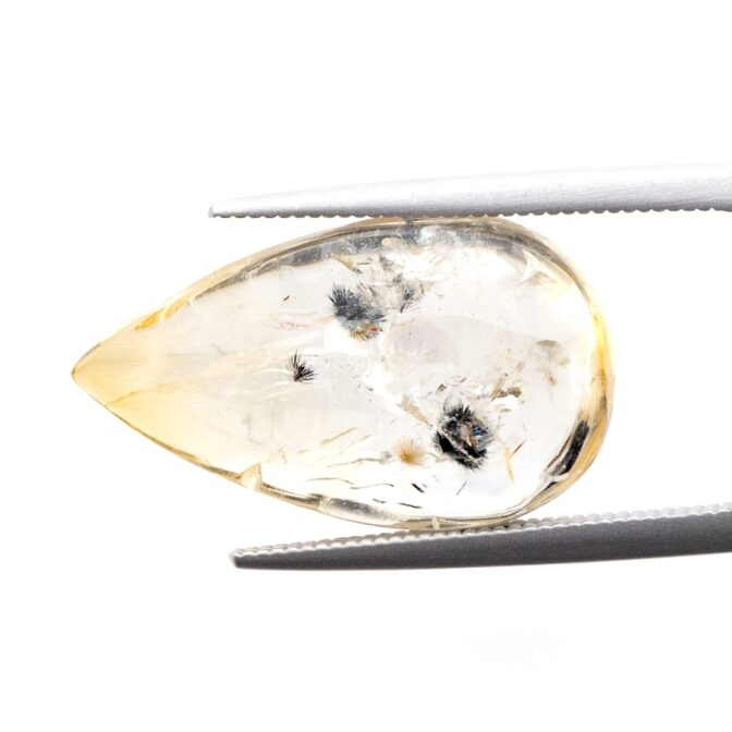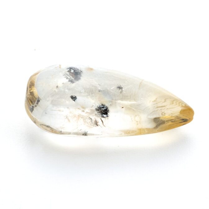 このページでご紹介しているルースは、ふんわりイエローのニュアンスとクリアなクォーツがそれだけで眼福の美しさ。そこに黒くふわふわのロマネサイトがしっかりと入っています。ティアドロップの形に磨かれ、黒いインクルージョンと、それを取り巻く虹色のインクルージョンが幻想的な世界を描きます。クォーツ系の石らしい魅力を持つうえ、とてもレアともなると、インクォーツ好きの心が騒ぎ出してしまいます。
