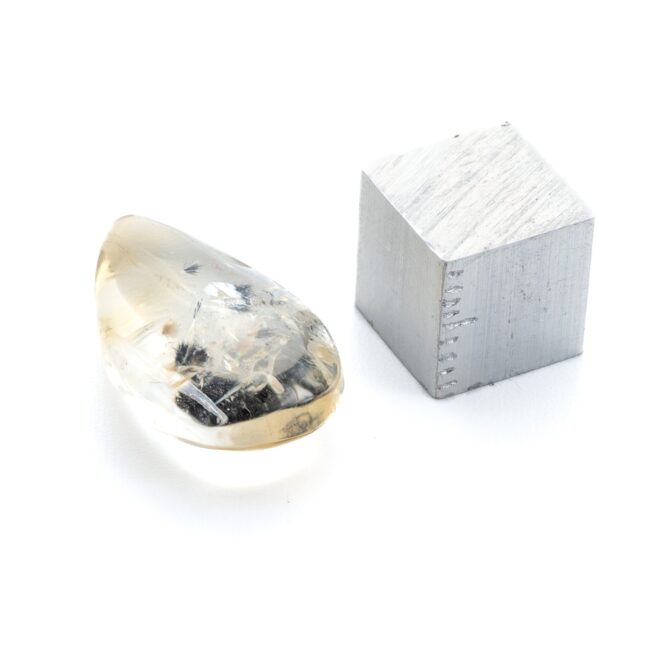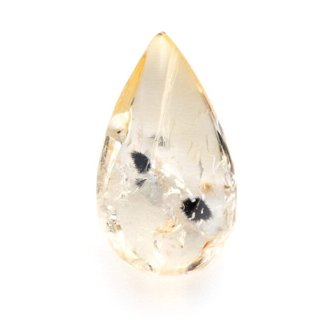 つやっつやのぷりぷり。シュッとスマートな雫シェイプに、レンズのように見えるほど磨かれた透明なクォーツと優しいイエローのシトリンが類まれな美しさ。その中に黒くふわふわしたロマネサイトが浮かぶ、希少ながらもとても可愛い魅力も持つインクォーツです。