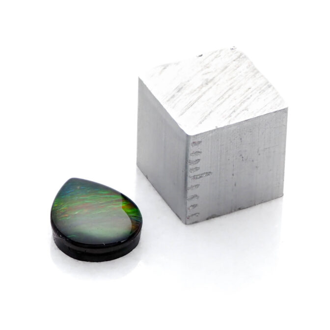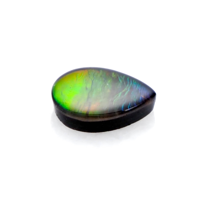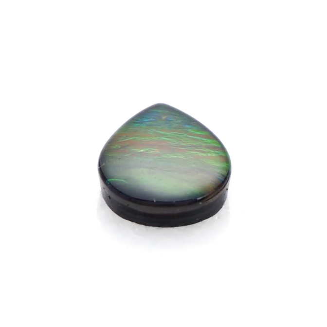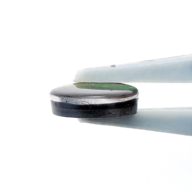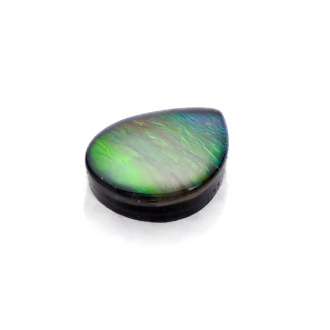 アンモライト層はとても薄くて壊れやすいもの。そこで、ルースにするときは他の石と組みわあわせ、ダブレットやトリプレットにします。母岩が厚く残っている場合は表面にクォーツやスピネルを張り合わせ、ダブレットに。母岩が薄い場合は裏にも補強のためにオニキスなどを貼り付けてトリプレットにします。このルースも安心してお使い頂けるトリプレットです。ちなみに、張り合わせの加工は通常全てのアンモライトルースに施されているので、ダブレットやトリプレットでも「天然」として扱われます。