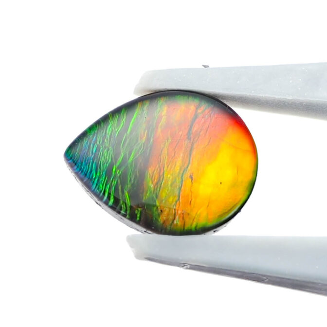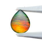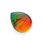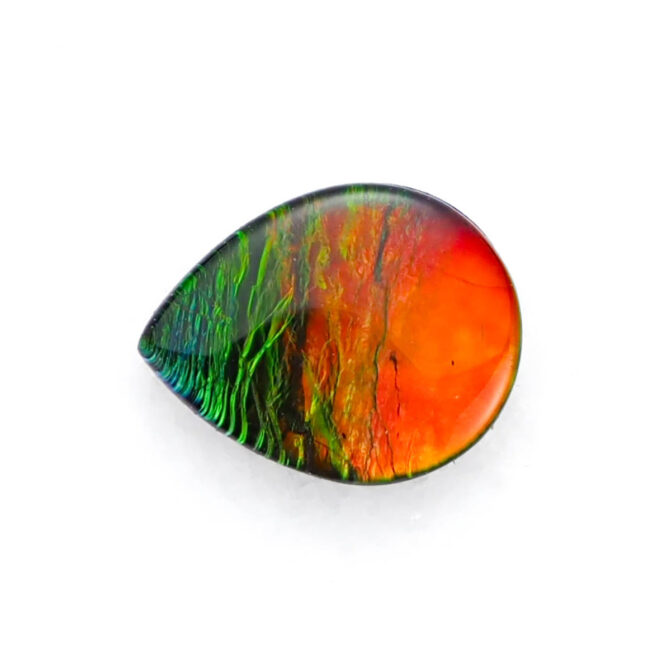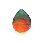このページでご紹介しているアンモライトのルースは、可愛らしいコロンとしたドロップ型。黄色みを帯びたオレンジ色の面積が大きく、深いグリーンがアクセントを添えています。光が当たるたびに色をわずかに変えながらきらめく様は、光と色のハーモニーが作り出す芸術です。