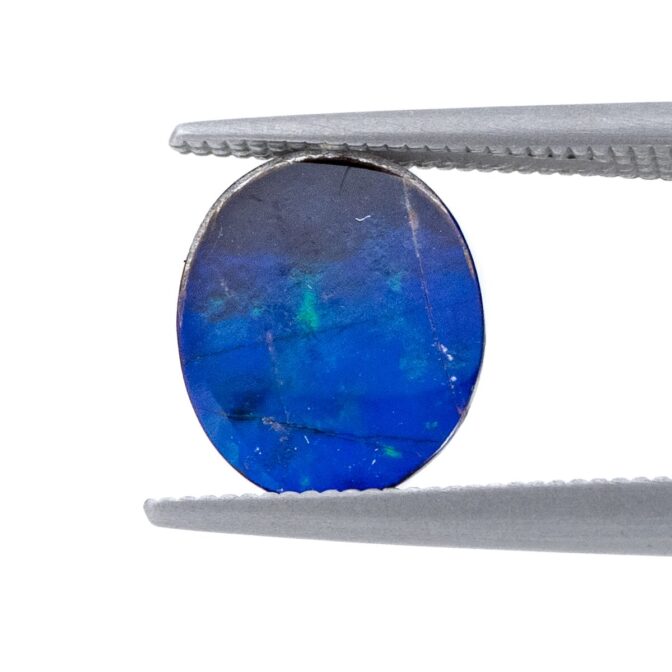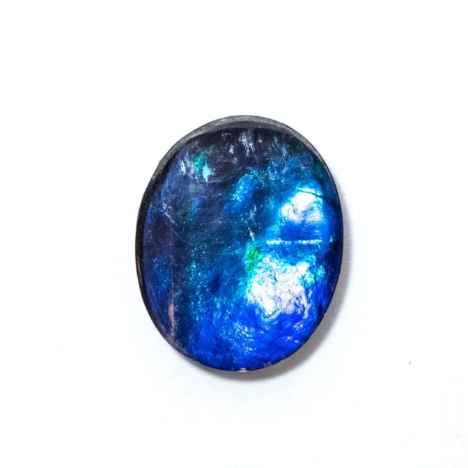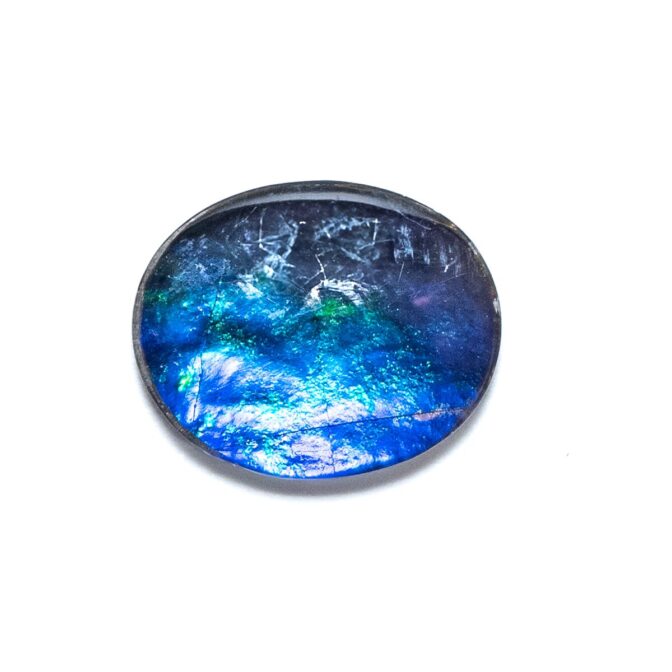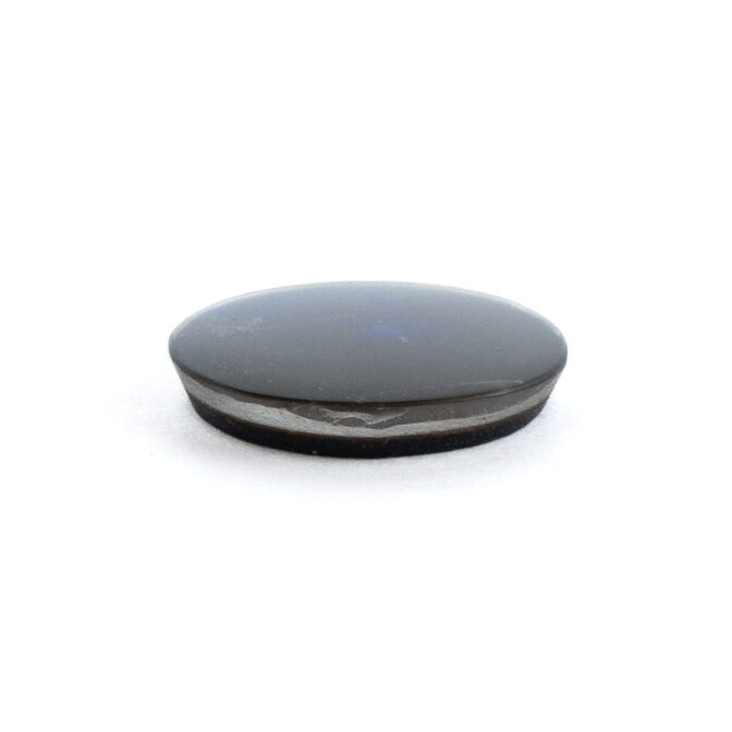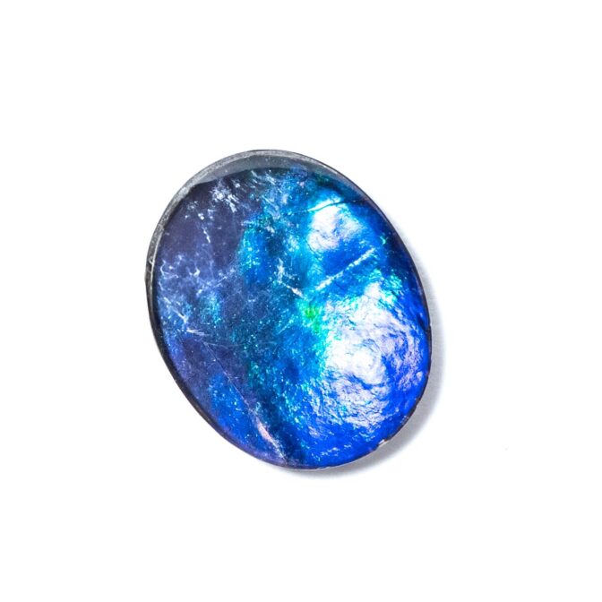 アンモライト層はとても薄くて壊れやすいもの。そこで、ルースにするときは他の石やバッキング素材と組みわあわせ、ダブレットやトリプレットにします。母岩が厚く残っている場合は表面にクォーツやスピネルを張り合わせ、ダブレットに。母岩が薄い場合は裏にも補強のためにオニキスなどを貼り付けてトリプレットにします。このルースも安心してお使い頂けるトリプレットです。ちなみに、張り合わせの加工は通常全てのアンモライトルースに施されているので、ダブレットやトリプレットでも「天然」として扱われます。