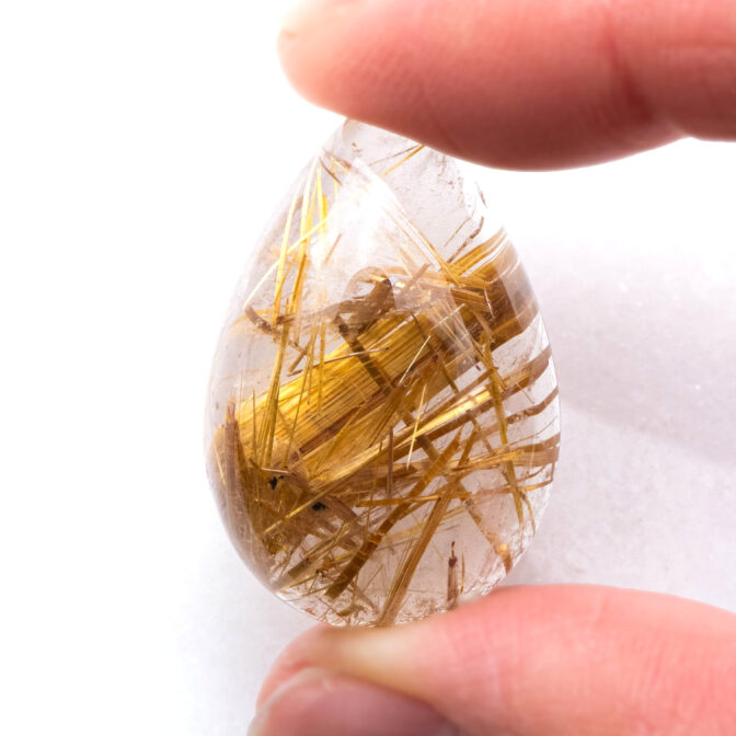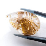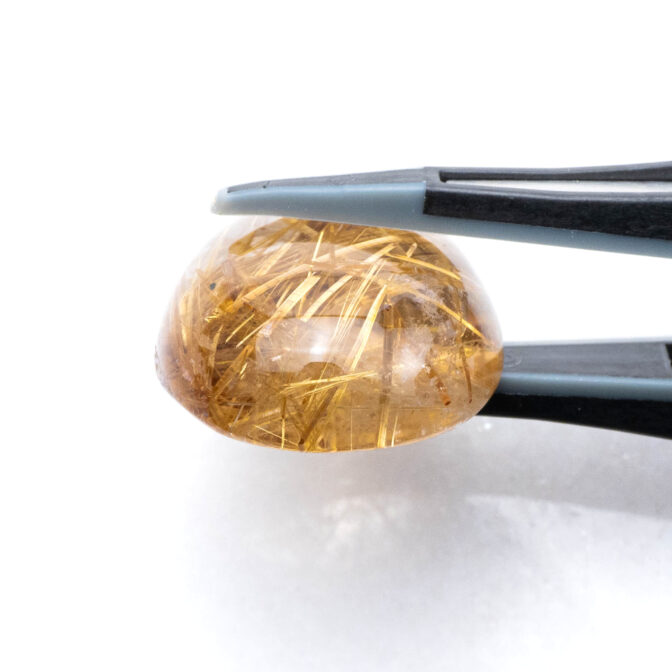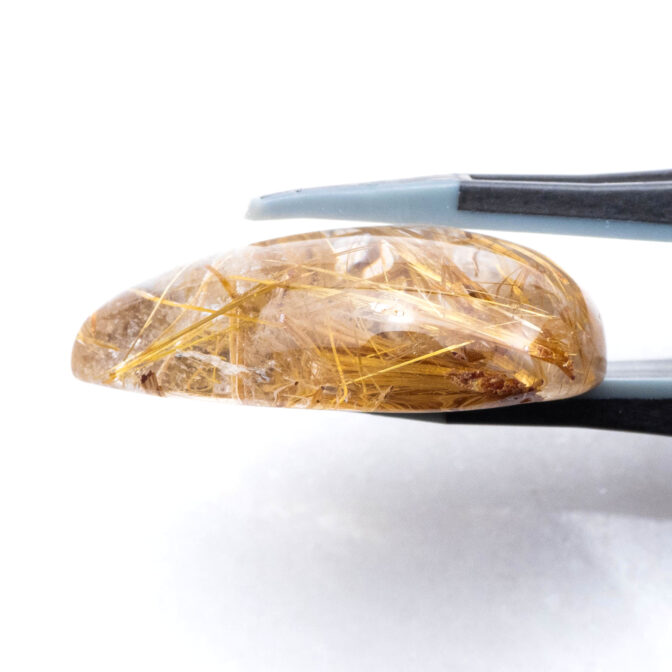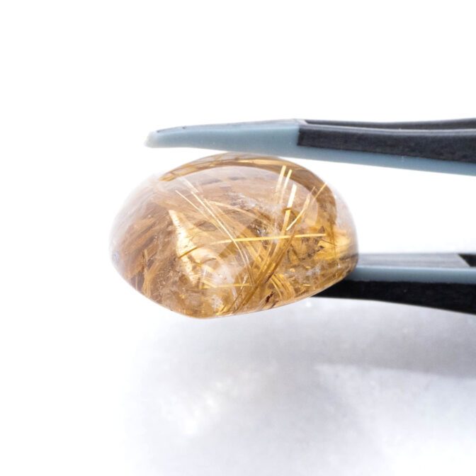 糸状の繊細なルチルが集まり、太いルチルの束を生み出しています。この細いルチルの輝きはまるで絹糸のようにシルキー。こちらのルースは太陽ルチルと同じ原石からカットされています。根本の黒いヘマタイトがない部分を選んでルースに仕立てておりますので、太陽ルチルの力強さは好きだけど、ルチルだけを楽しみたい!という方におすすめです。