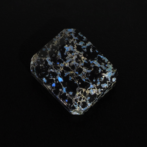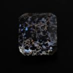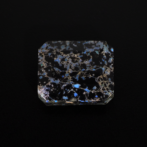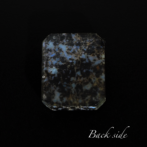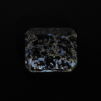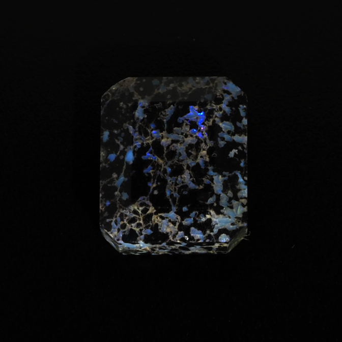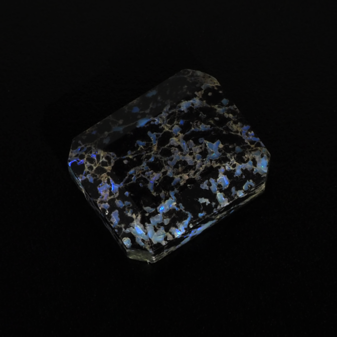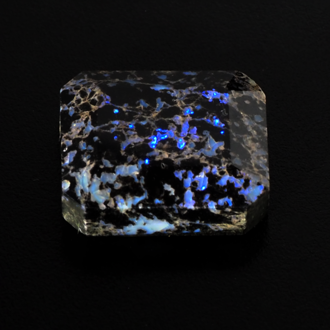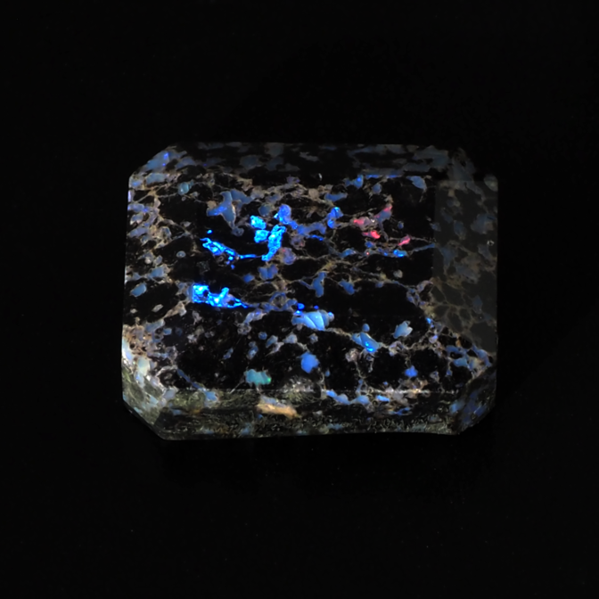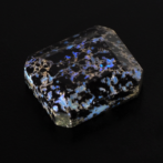 このページでご紹介しているレオパードオパールは、端正なエメラルドカットが施されています。玄武岩のブラックとブラウンの母岩の中から藤色に近い神秘的なブルーの輝きが石全体を巡ります。角度によってグリーンや赤のの輝きがぎらりと現れ、抑制された色味の中に迫力の遊色がジワリと湧き出す様子はなんとも通好み。透明でキラキラした石とは全く違う別格のワイルドさを醸し出します。