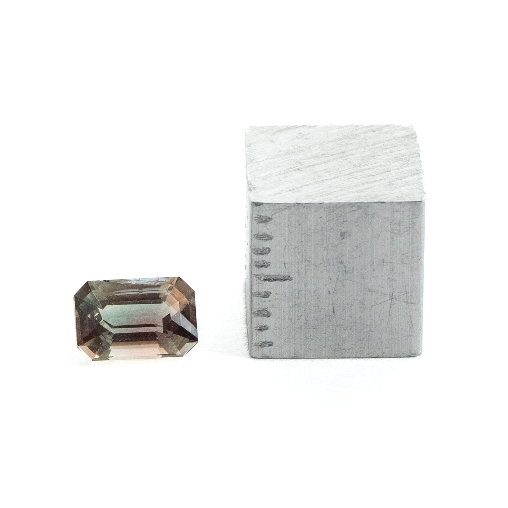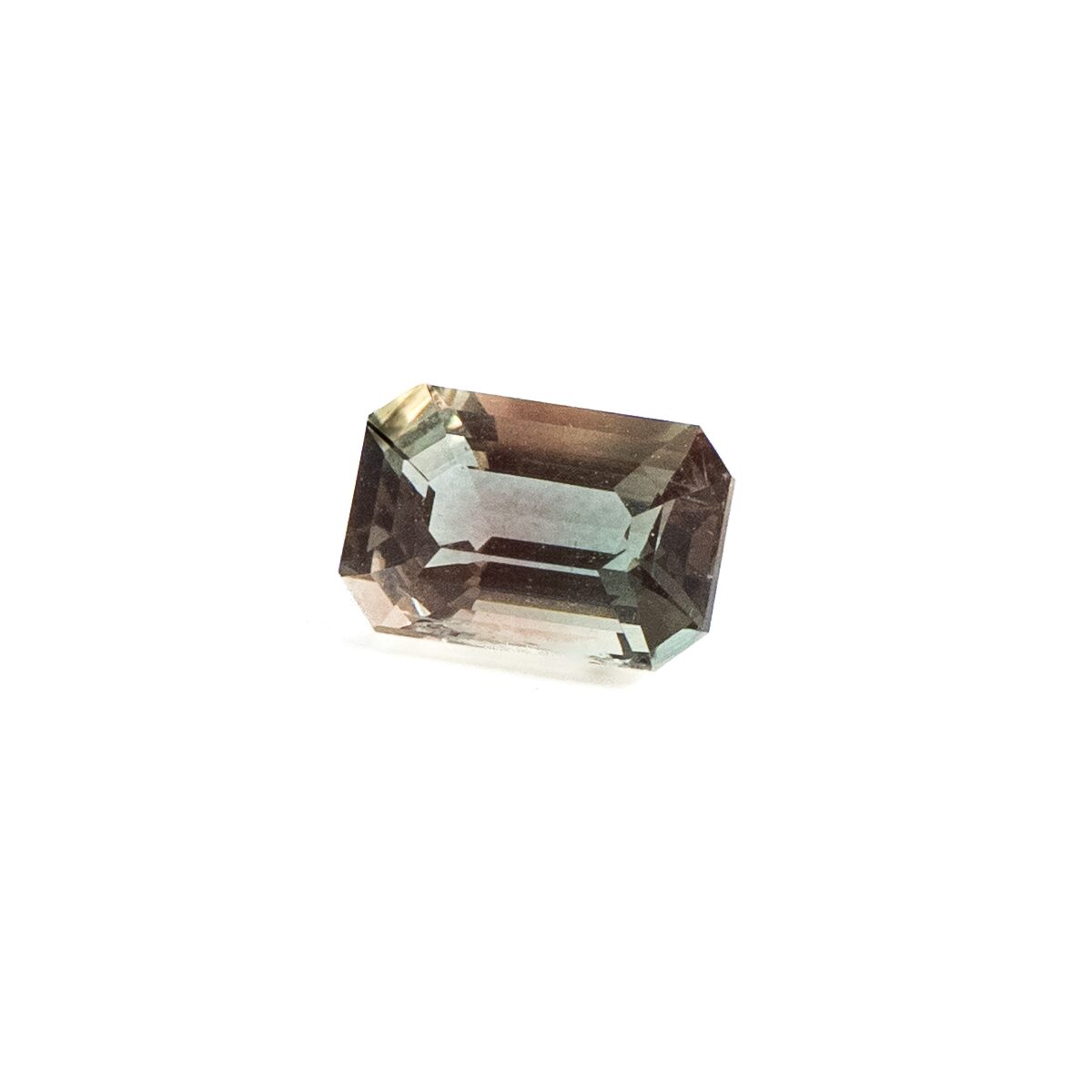 一見、静謐な深い森を思わせるフォレスト・グリーン。しかし、光が内部を透過し、端正なエメラルドカットのファセットに反射する瞬間、その奥底から鮮烈な赤い色彩がバイカラーとなって浮かび上がります。