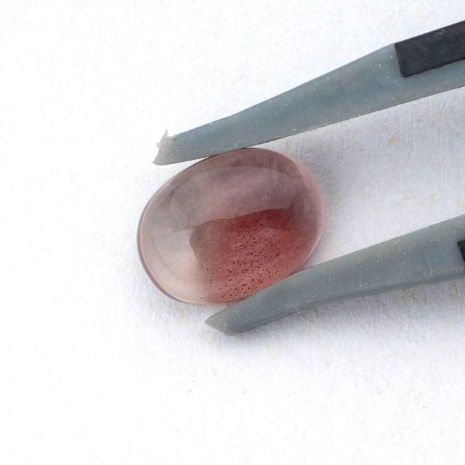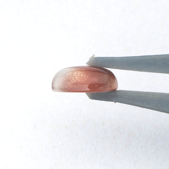 細かな銅インクルージョンが粉雪のように舞いながらちらちらと輝く魅惑的なルース。鮮やかなオレンジレッドは強く濃い色合い。その鮮やかな色に柔らかなグリーンがかぶさり、絶妙なグラデーションを描きます。とても個性が強く普通なら喧嘩してしまいそうなそうなほどの色ですが、透明感溢れるうるうるとした質感とクリアな部分で抜け感が出るため、くどくなくとても可愛くまとまっています。