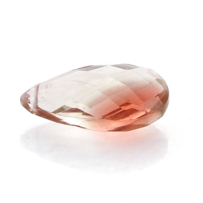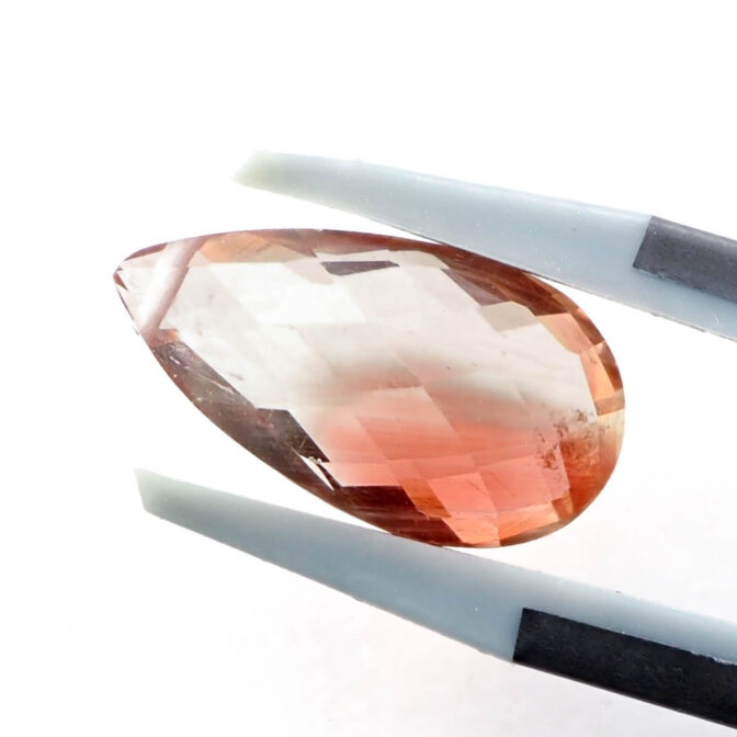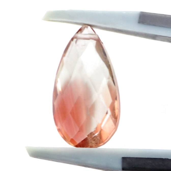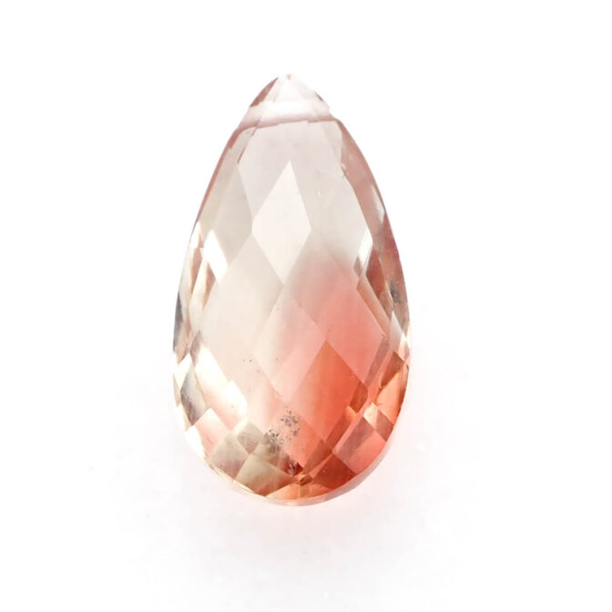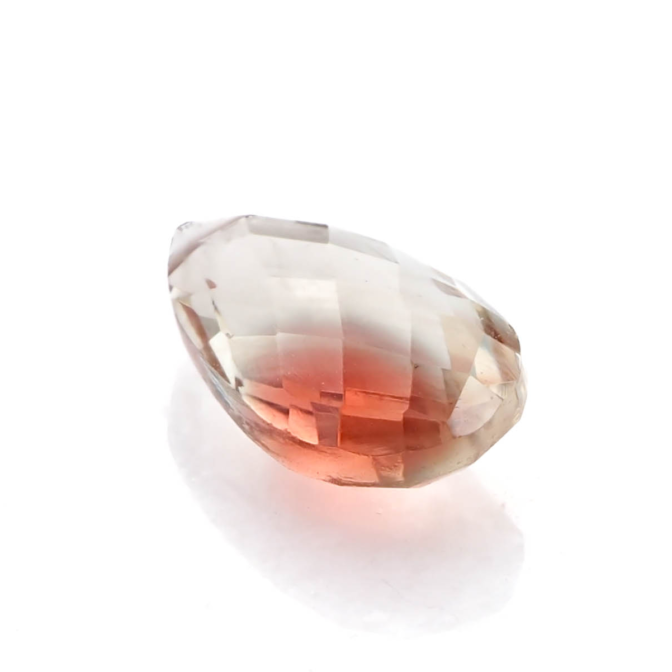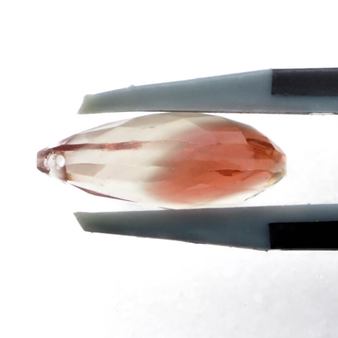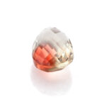 このページでご紹介するルースは、しずく型にカットされた石の前面に細かなブリオレットカットが施され、想像を絶するほど華やかなきらめきを宿します。全体が薄いオレンジですが、部分的に濃いオレンジがふんわりと入っており、そこを濃いグリーンのラインが縁取っています。とても個性が強く喧嘩してもおかしくない色あわせですが、透明感溢れるうるうるとした質感とクリアな部分で抜け感が出るため、くどさはなくとても可愛くまとまっています。トップに穴が開いているため、比較的簡単にアクセサリに加工できるのも魅力です。