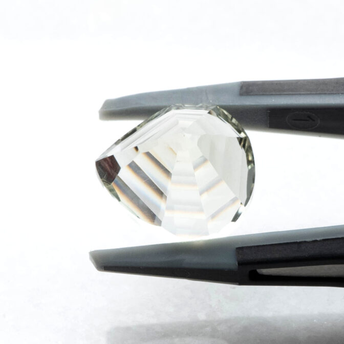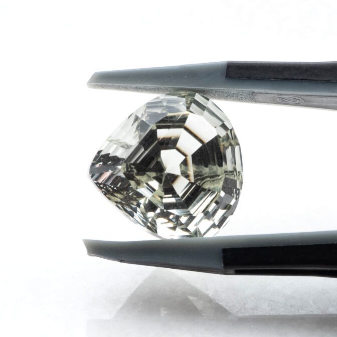 透明感あふれる爽やかなミントグリーンに、華やかな輝きを生み出す複雑なカットが施され、夢のように美しく輝くグリーンアメジストのルースが入荷しました。ふっくらとしたティアドロップシェイプに、シャープなきらめきを生み出すコンケーブカットが、幻惑されてしまうような不思議な視覚効果をもたらします。きっちりと正確に、丁寧にカットされ、至上のきらめきを手に入れたグリーンアメジストは芸術的な美しさです。
