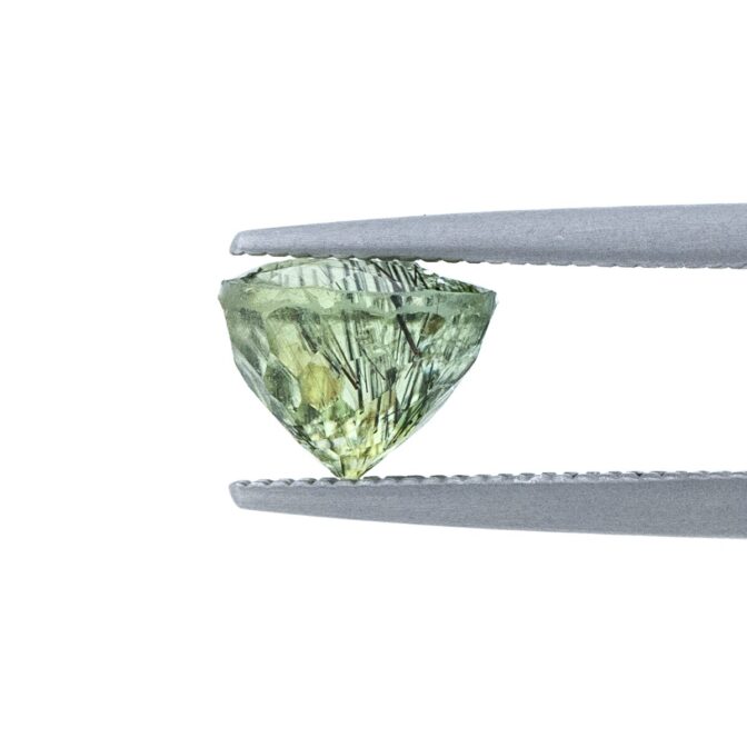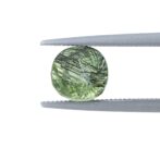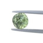こっくりと深く鮮やかなグリーンが上品にきらめくペリドット。スタンダードなラウンドブリリアントカットはとても珍しく、気品に溢れた清々しいシャープな輝きを生み出します。豊かな色合いと透明感が美しいルースの中に黒いルチル状のインクルージョンが入り、さらに希少さを増しています。