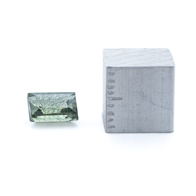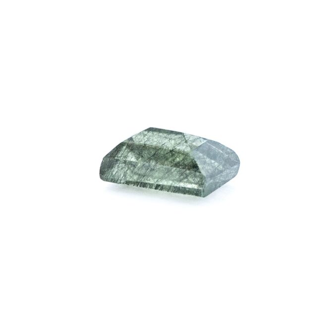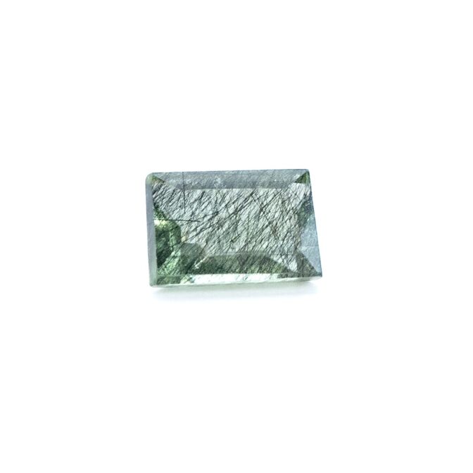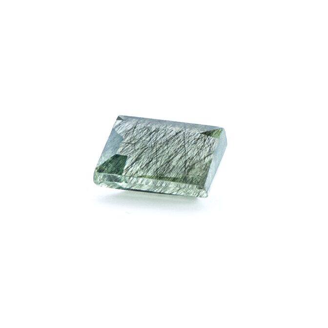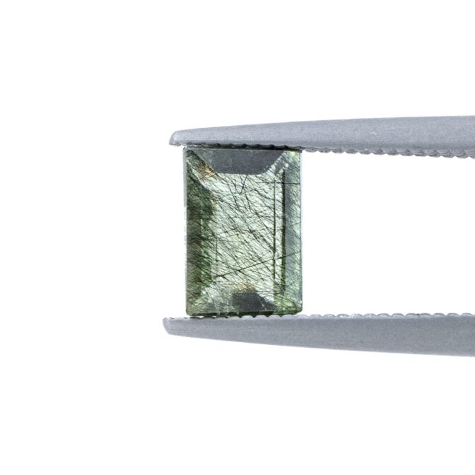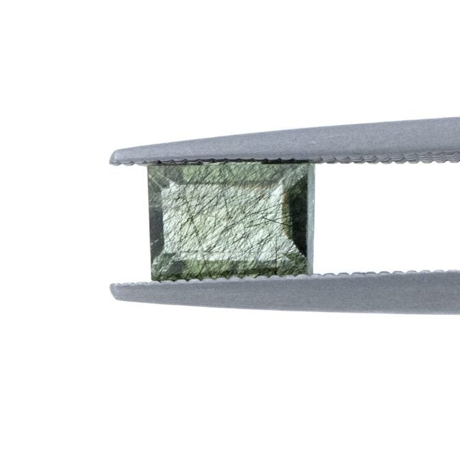 こっくりと深く鮮やかなグリーンが上品にきらめくペリドット。端正なスクエアのカットは気品に溢れ、清々しいシャープな輝きを生み出します。豊かな色合いと透明感が美しいルースの中に黒いルチル状のインクルージョンが入り、さらに希少さを増しています。