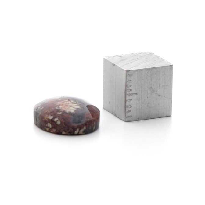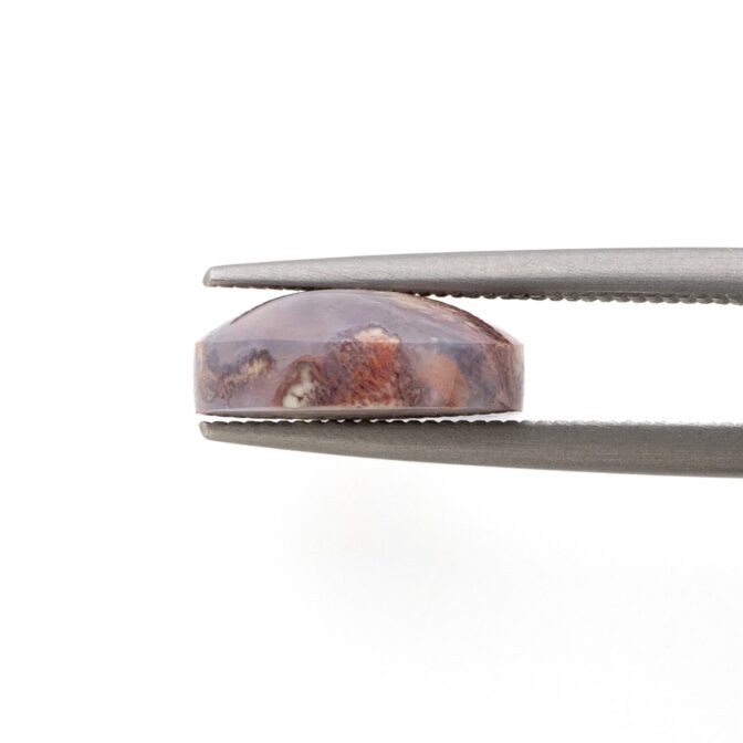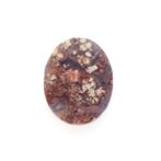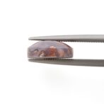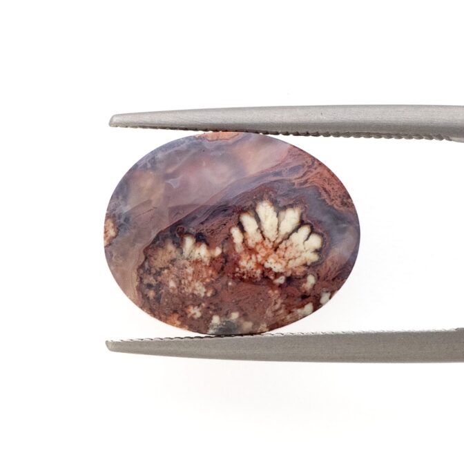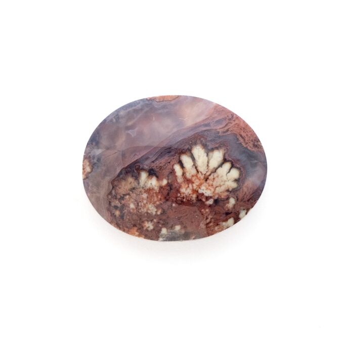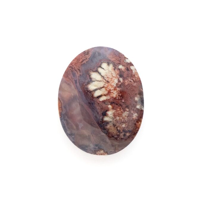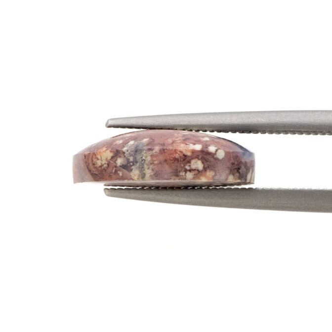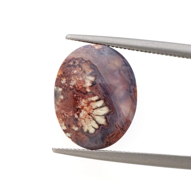 このページでご紹介しているルースは、華やかな赤みのある茂みの中から、白い大輪の花が咲きこぼれているような魅惑的なデザイン。インクルージョンが多い石は硬度差があるため、とても研磨が難しいのですが、このルースは形よくつやつや。ふっくらした丸みのあるオーバルシェイプで、滴り落ちそうなみずみずしさです。インクルージョンがぎっしりとある部分と、清々しい透明度を誇る部分がバランスよく配置されており、どこをとっても見惚れてしまう美しさ。裏側も華やかで、どちらを表にしようか迷ってしまうほど。上質な原石から丁寧にカットされ、手間暇をかけてつるりと磨かれた、一点もののオーラが溢れてます。