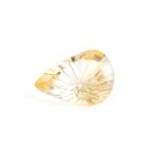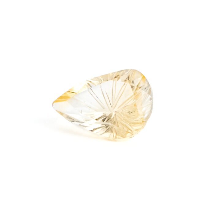 その秘密は裏面にあります。よく見ると、裏面のファセットカットの間を、流れるように細く繊細なラインが入り組むように彫り込んであり、これが複雑なきらめきを生み出しているのです。表面がシンプルなカットなのは、むしろこのラインを引き立たせるためでもあります。巧妙なトリックにも似た計算された美には、採算や価格以上に、職人のこだわりとそれを積極的にサポートする環境あってのもの。クォーツ系の石であるシトリンの奥深さを愛し、その美しさを理解し尽くしているからこそ生まれる奇跡のようなルースなのです。