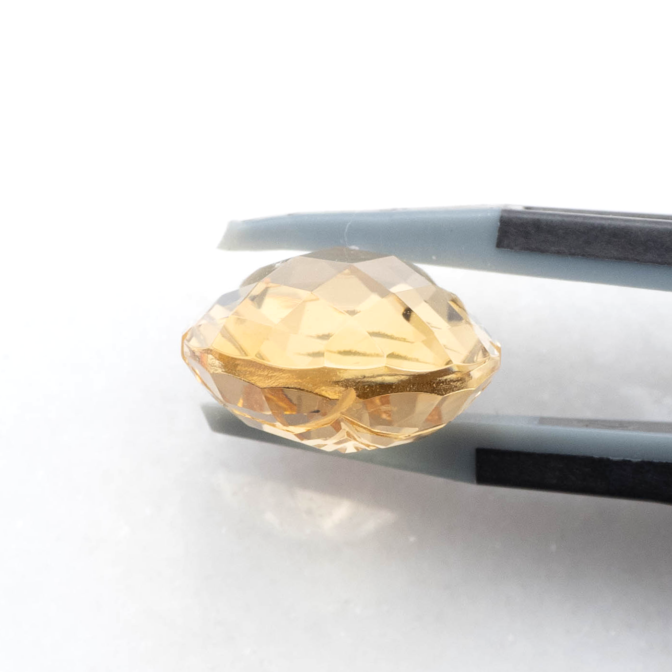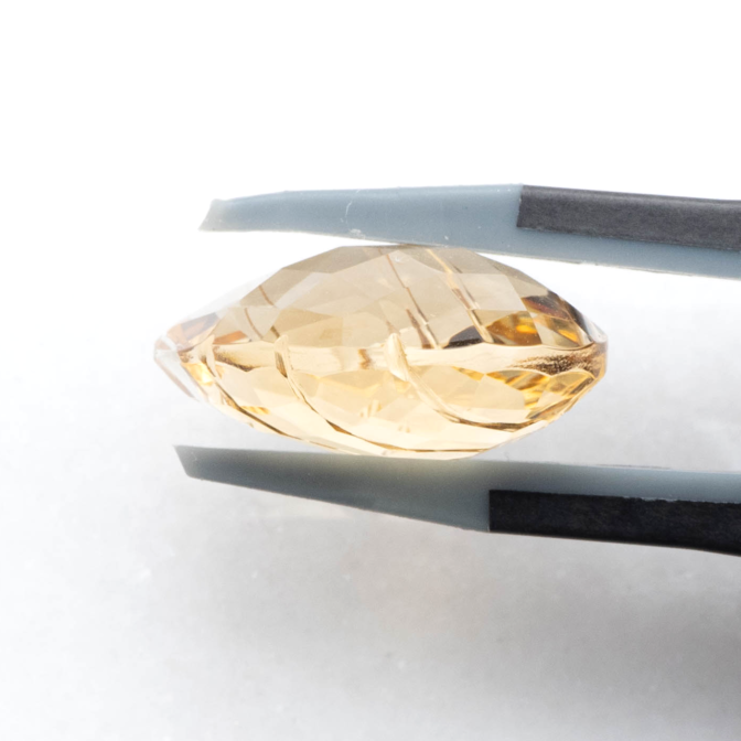 このページでご紹介するのは、上質な原石から手の込んだ丁寧なカットで、シトリンの美しさを存分に引き出した美しいルース。シトリンらしいややオレンジがかったイエローが全体に均一に入っており、その透明感の素晴らしさはまさしくクォーツらしい輝きと言えるでしょう。表面にはきらめくチェスカットが施されており、裏面にはチェスカットの上に細く繊細、かつシャープなラインが掘り込まれており、複雑なきらめきを生み出します。(もちろん、こちらの面を表に使ってもユニークです!)表面がシンプルなチェスカットなのは、このラインを引き立たせるためでもあります。巧妙なトリックにも似た計算された美には、採算や価格以上に職人のこだわりと、それを積極的にサポートする環境あってのもの。クォーツの奥深さを愛し、その美しさを理解し尽くしているからこそ生まれる奇跡のようなルースなのです。
