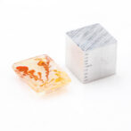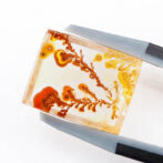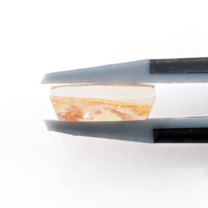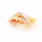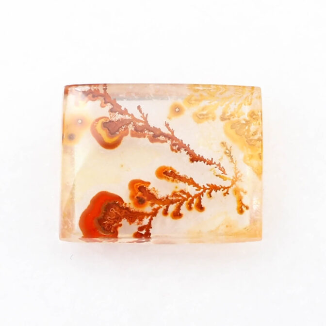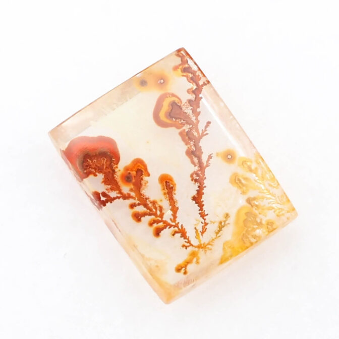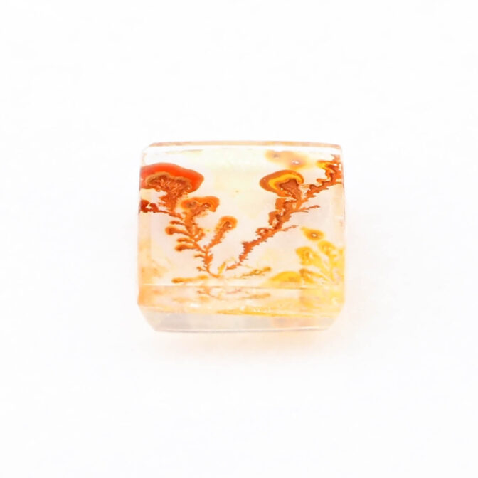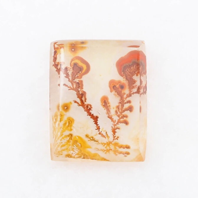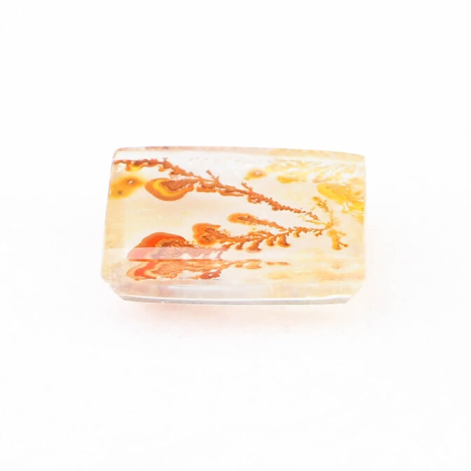 その柔らかにゆらめくインクルージョンの様子から、軟質の珊瑚が海流になびいているかのように見えます。人によっては全く違う景色に見えるかもしれません。ハーバリウムをそのまま石にしてみました、と言われても信じてしまいそう。こんな不思議な光景を宿す石が、きちんと角がある長方形にカットされると、品よく額縁に収まっているようでより味わいが深まります。