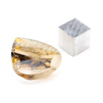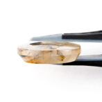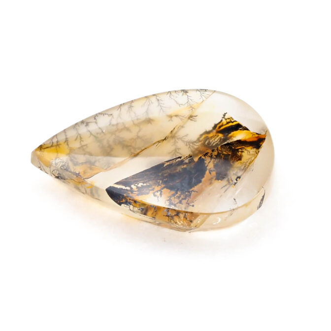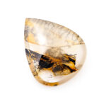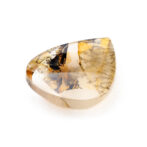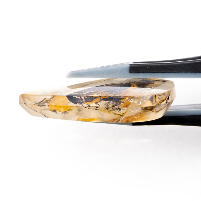 模様を楽しむには大粒にカットするのが良し。リングにはできない大きさですが、ペンダントトップやブローチに加工するとジュエリーとして映えそうです。ふっくらとしたティアドロップシェイプは、スパイスの効いた模様とイエローブラウンの色合いが功を奏し、甘すぎず辛すぎずの絶妙テイスト。厚みがないので身につけやすいジュエリーになりそうです。透明度の高い上質クォーツと個性的な模様の組み合わせが斬新な美を奏でます。