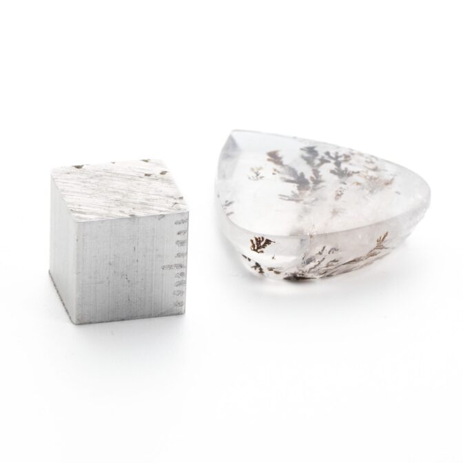 「デンドリ」という言葉のルーツはギリシャ語の「樹形」から来ています。「ティック」とは「シネマティック」「ロマンティック」などの外来語でもお馴染みの「〜のような」を示す接尾語。「デンドリティッククォーツ」とは、まるで植物のような模様を内包したクォーツ(水晶)という意味です。