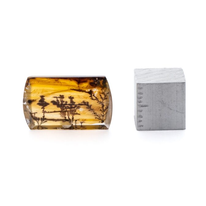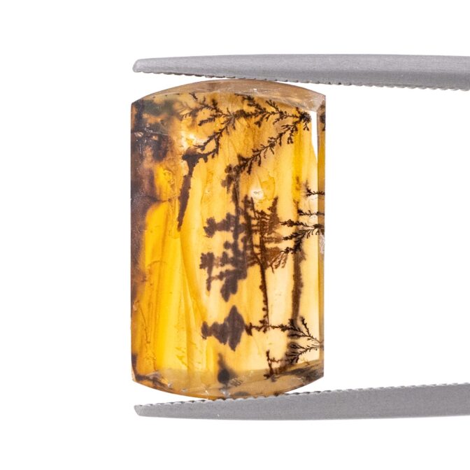 「デンドリ」という言葉のルーツはギリシャ語の「樹形」から来ています。「ティック」とは「シネマティック」「ロマンティック」などの外来語でもお馴染みの「〜のような」を示す接尾語。「デンドリティッククォーツ」とは、まるで植物のような模様を内包したクォーツ(水晶)という意味です。その名の通り、まるで植物をそのまま閉じ込めてしまったような内包物は、見れば見るほど繊細。葉や枝に生えるうぶ毛まで再現されているかのような緻密さで、見れば見るほど不思議で可愛らしくも思えます。人間のいない植物の楽園で、静謐な空気感すらも再現したリアルな風景画を思わせます。