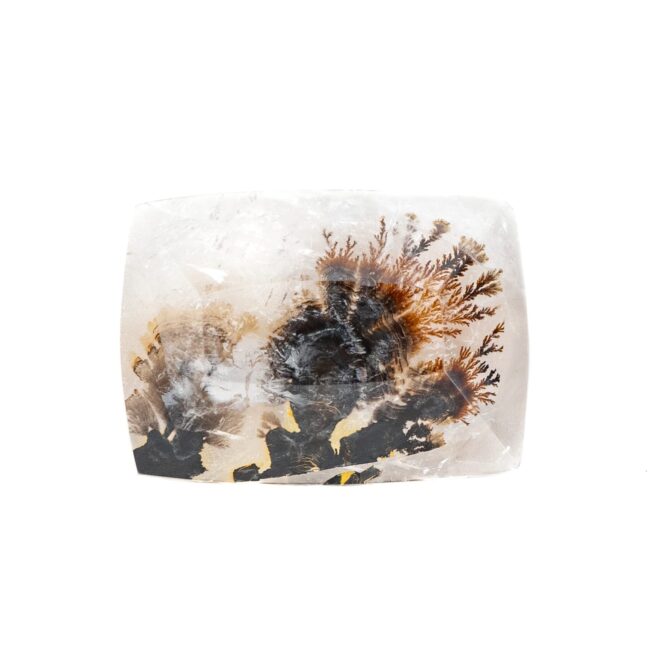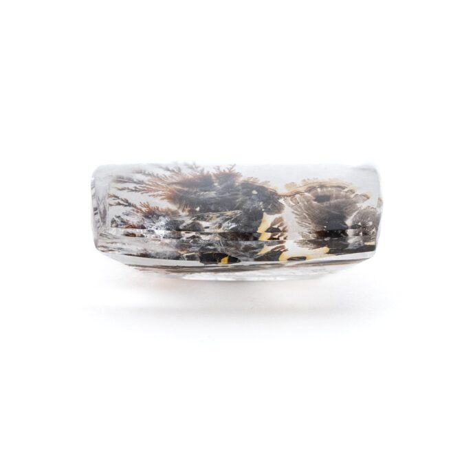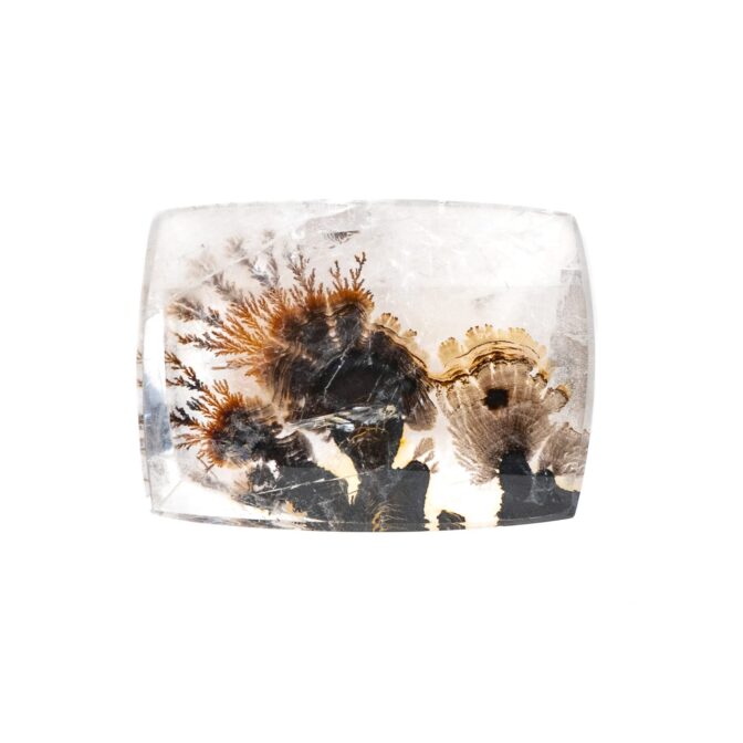 「デンドリ」という言葉のルーツはギリシャ語の「樹形」から来ています。「ティック」とは「シネマティック」「ロマンティック」などの外来語でもお馴染みの「〜のような」を示す接尾語。「デンドリティッククォーツ」とは、まるで植物のような模様を内包したクォーツ(水晶)という意味です。その名の通り、まるで植物をそのまま閉じ込めてしまったような内包物は、見れば見るほど繊細。葉や枝に生えるうぶ毛まで再現されているかのような緻密さで、見れば見るほど不思議で可愛らしくも思えます。人間のいない植物の楽園で、静謐な空気感すらも再現したリアルな風景画を思わせます。