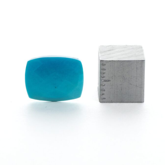 見ているだけで爽やかな風が吹き抜けそうなターコイズ。ジュエリーにしたら夏のコーデにとても映えそうです。厚みがなく、ターコイズ自体が軽いので、存在感がありつつも軽やかに身につけられるのがいいところ。あえて、従来のターコイズのイメージにそぐわぬような、繊細な細工や華奢な仕立てのリングにしたらとてもおしゃれだと思います。